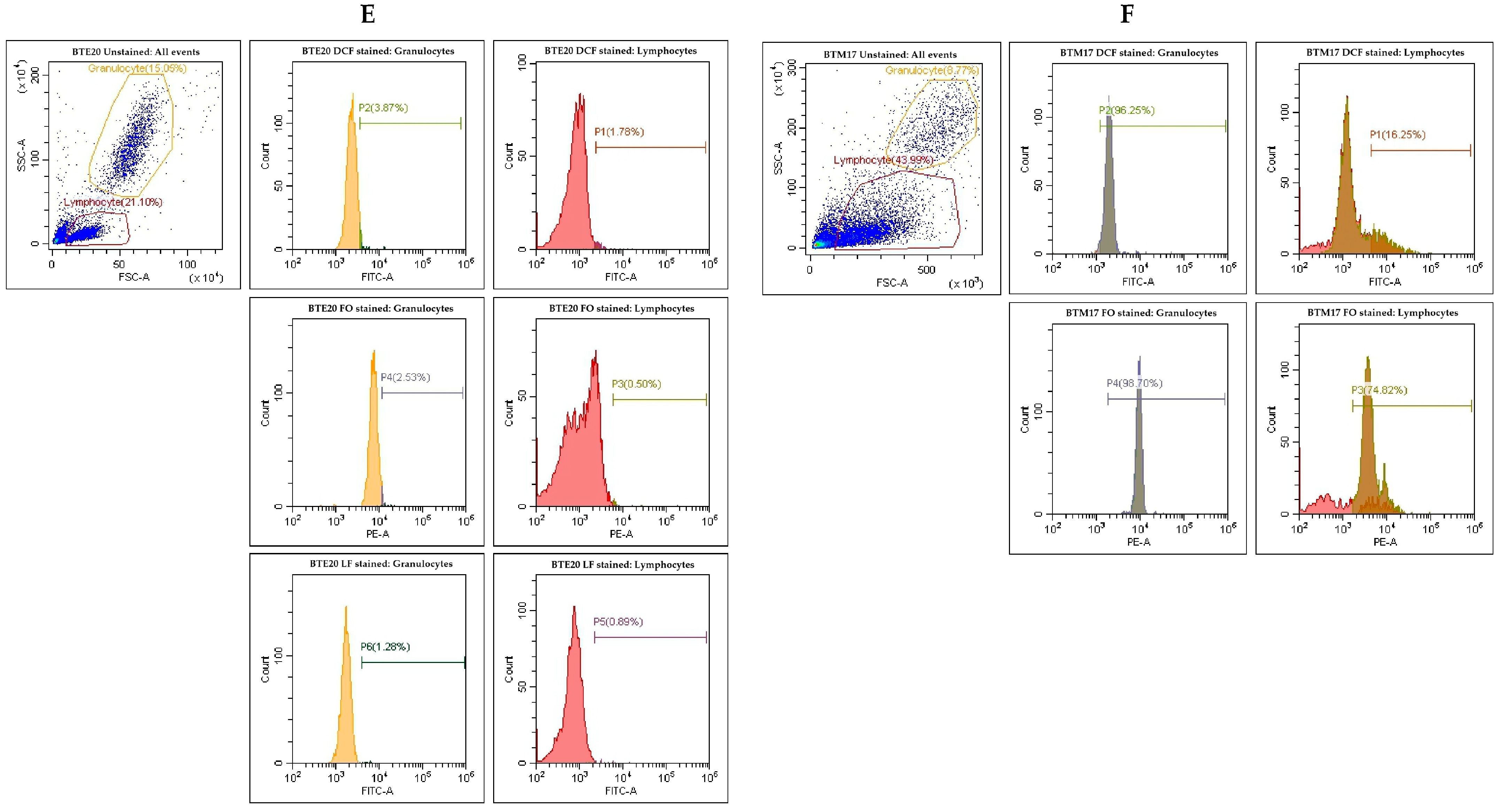 25]. Briefly, 0.1 mL of leucocyte suspension was stained with 5 µL of 20 µM LF (prepared in 1% DMSO) and incubated at 37 °C for 15 min. Subsequently, 100 µM cumene hydroperoxide was added to induce lipid peroxidation, and cells were incubated at 37 °C for two hours. Cells were then washed twice with PBS. The FI was measured using the BD FACSAria III flow cytometer with excitation at 488 nm and emission at 535 nm. Data were acquired and analyzed using BD FACSDiva version 9.0.