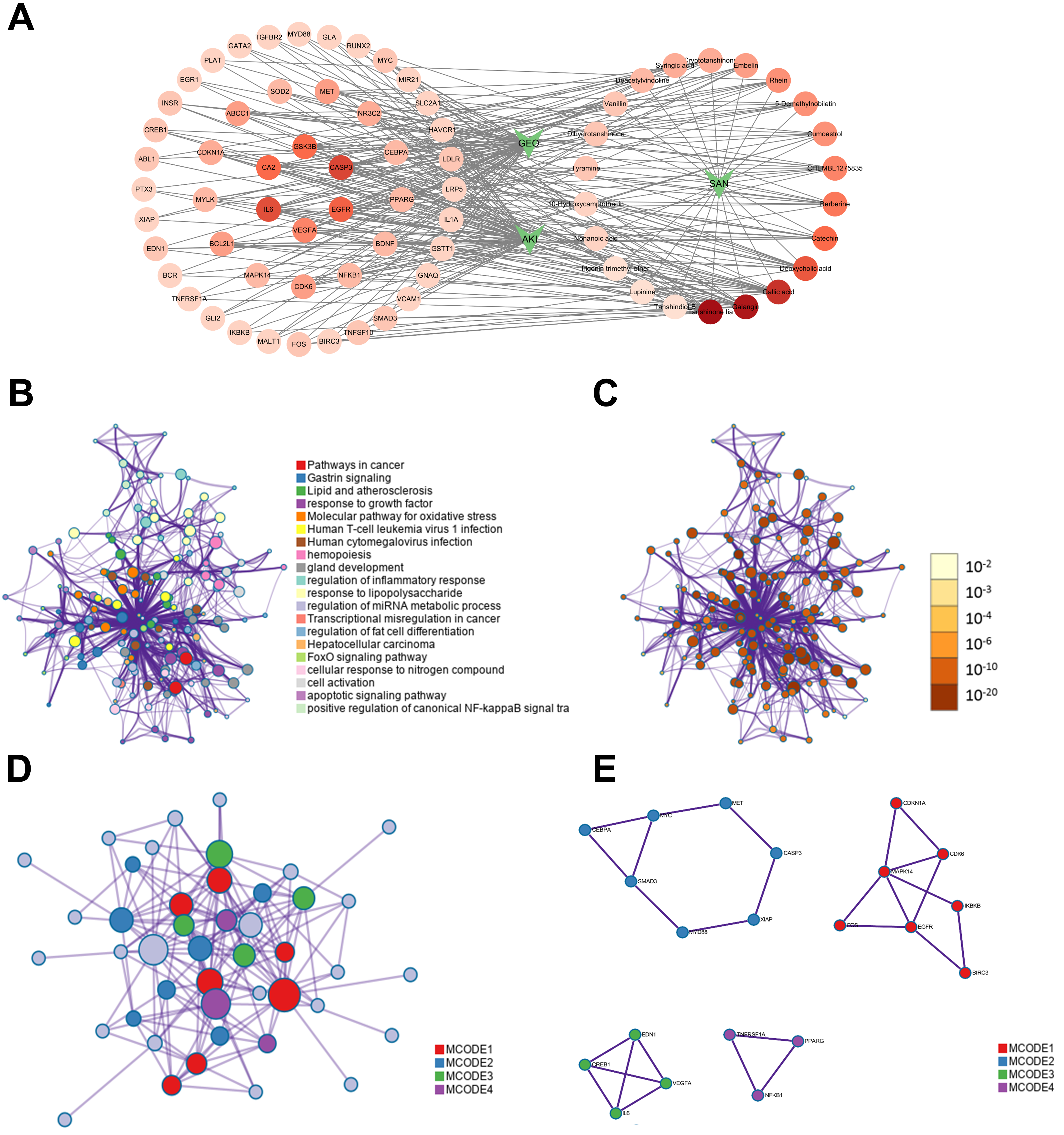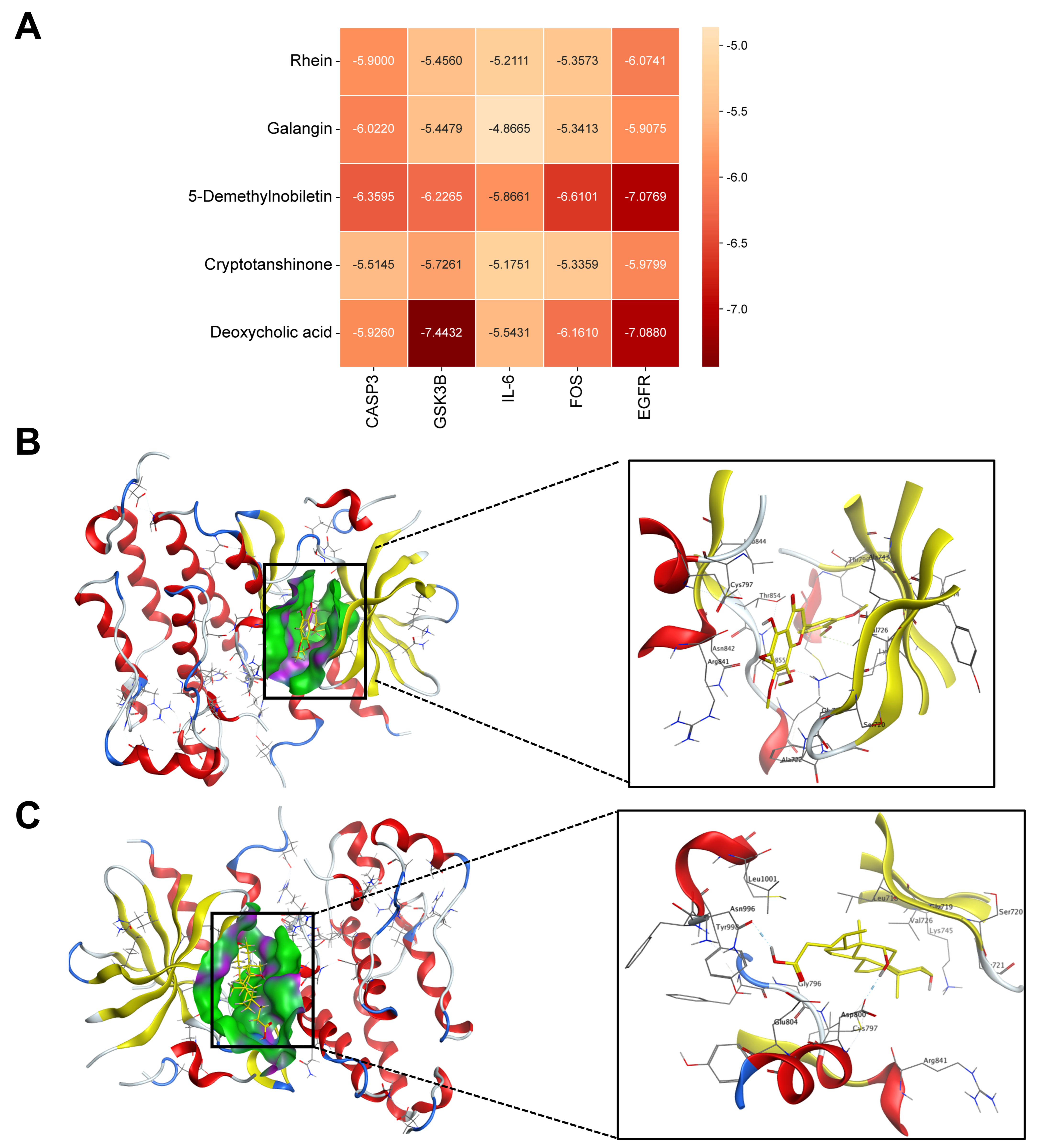 Molecular docking simulations were performed to evaluate the interactions between five key RSNPs constituents (cryptotanshinone, galangin, 5-demethylnobiletin, rhein, and deoxycholic acid) and five hub targets relevant to AKI (IL-6, CASP3, GSK3B, EGFR, and FOS) (