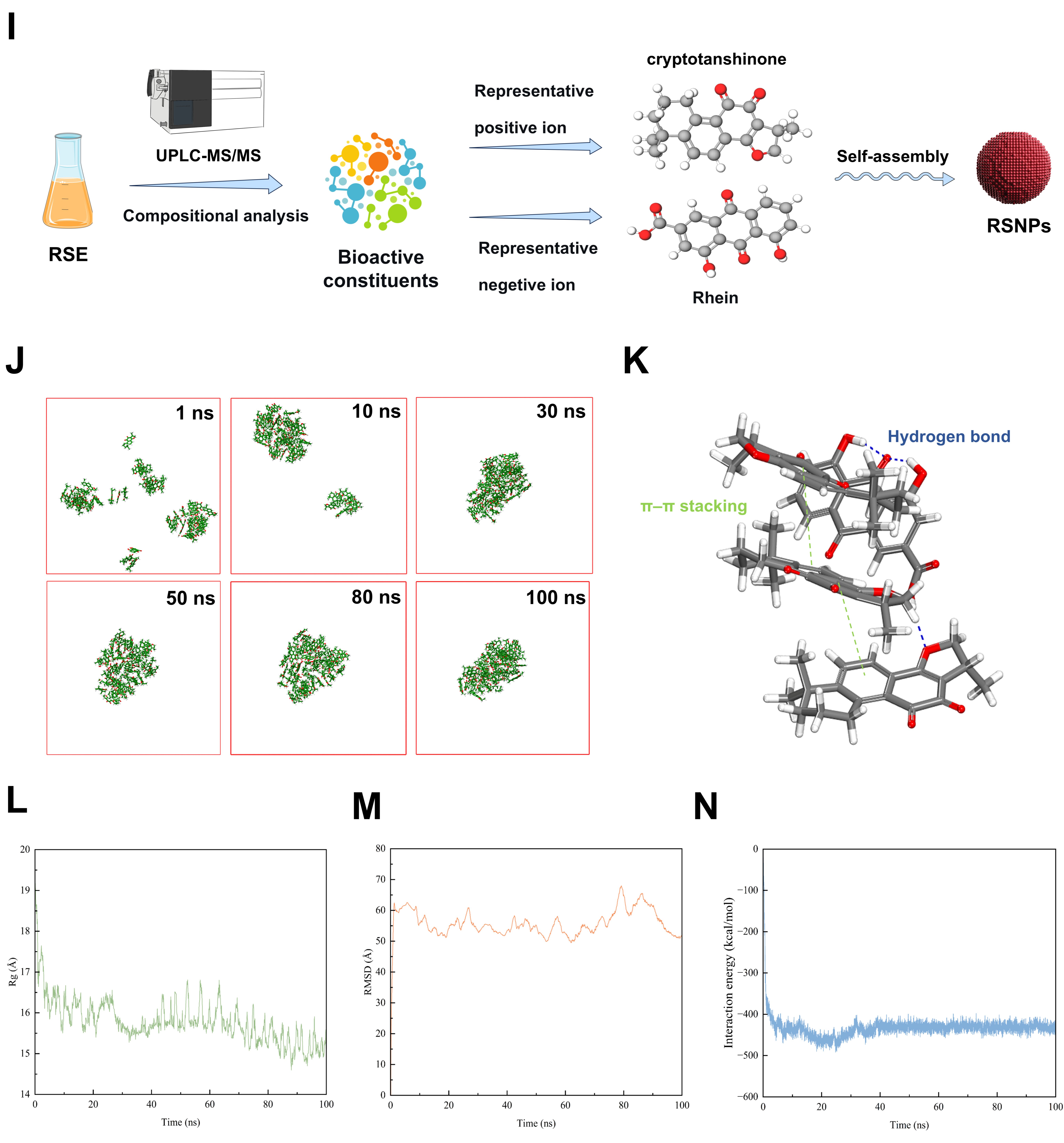 Cryptotanshinone and rhein were selected for molecular dynamics simulations based on their high mass fraction in the nanoparticle system, their role as core bioactive constituents in their respective source materials, and their structural predisposition for driving self-assembly. The simulations elucidated the molecular-level mechanism of RSNPs’ spontaneous self-assembly, revealing a well-defined hierarchical pathway. During the 100 ns simulation, the system—composed of 10 rhein molecules and 38 cryptotanshinone molecules—progressed through three distinct stages: initial nucleation (0–10 ns), characterized by molecular clustering; structural consolidation (10–30 ns), marked by hydrophobic core formation; and equilibrium stabilization (30–100 ns), leading to mature core–shell architectures (