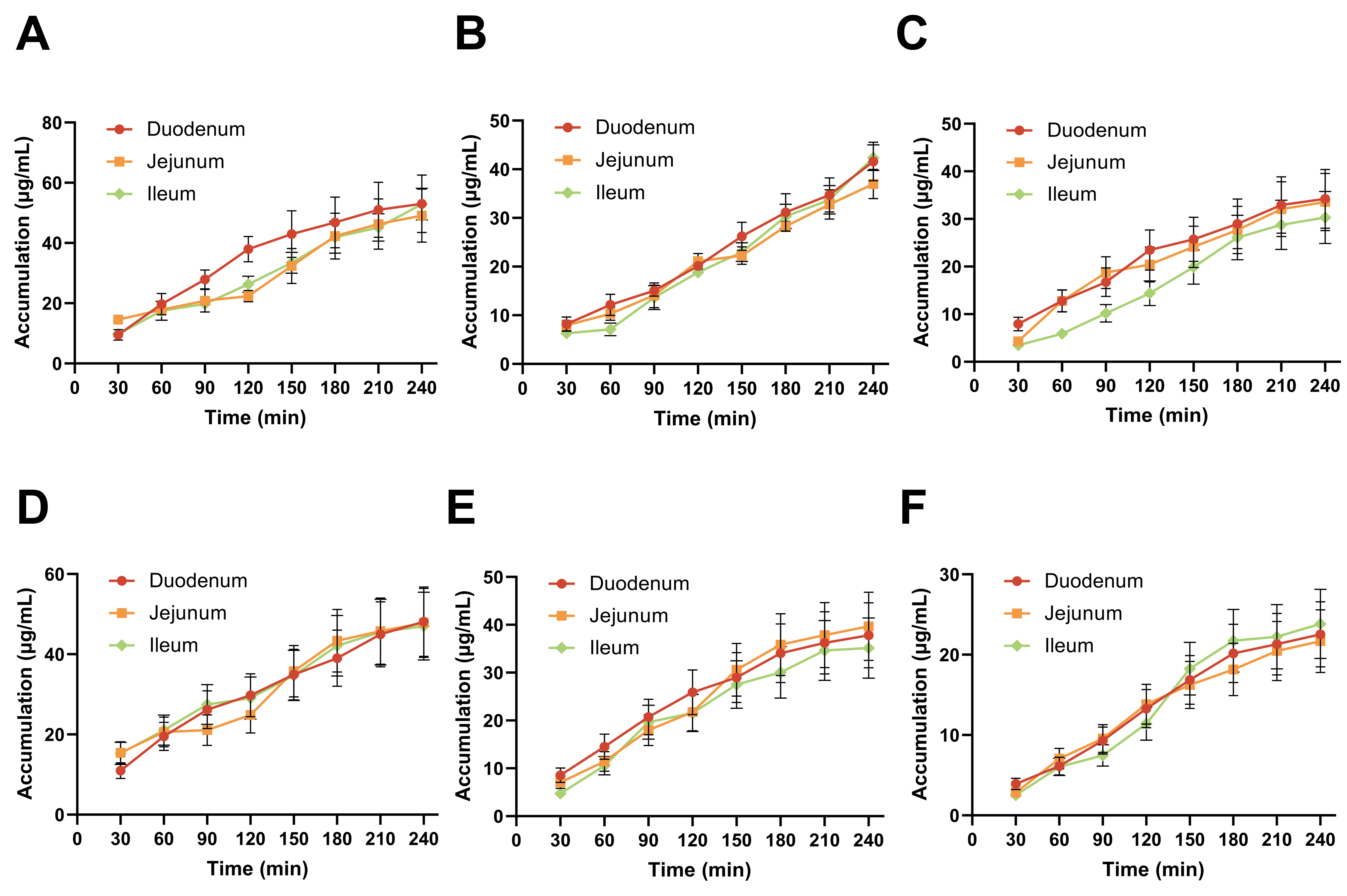 Accumulation of both compounds increased in the duodenum, jejunum, and ileum as concentrations rose from 5 to 10 mg/mL (