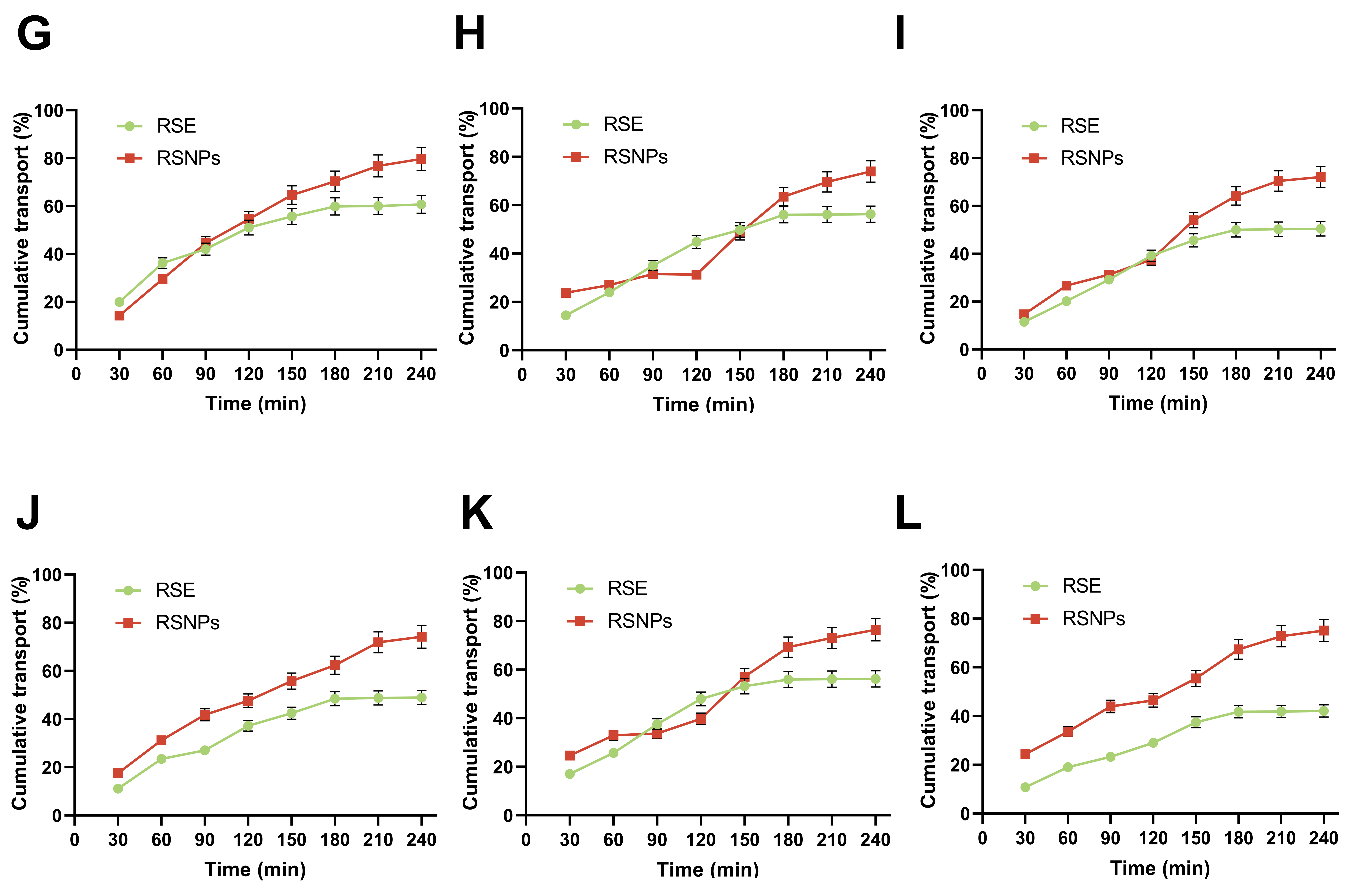 Figure 7A,B). Cryptotanshinone displayed sustained-release properties, with rapid initial accumulation during 0–120 min followed by markedly slowed absorption rates—suggesting either controlled release behavior or potential transporter saturation. In contrast, rhein absorption occurred more rapidly, reaching near-maximal levels within 60 min and plateauing by 120 min, indicating either enhanced permeability or faster release from the nanocarrier. Regional analysis identified the duodenum as the primary absorption site for both formulations, showing higher accumulation levels and rates than the jejunum and ileum. Notably, rhein showed better accumulation in jejunal and ileal regions at medium and high concentrations (7.5 and 10 mg/mL), implying distinct transport mechanisms that may involve regional differences in efflux transporter expression or paracellular permeability. RSNPs demonstrated comprehensive advantages in transport efficiency over RSE. The nanoparticles enhanced transmembrane transport in the duodenum, as reflected by steeper cumulative transport percentage-time curves. In distal intestinal regions, RSNPs particularly improved cryptotanshinone transport in the ileum and enhanced rhein absorption in the jejunum, effectively overcoming regional absorption barriers for both compounds (
