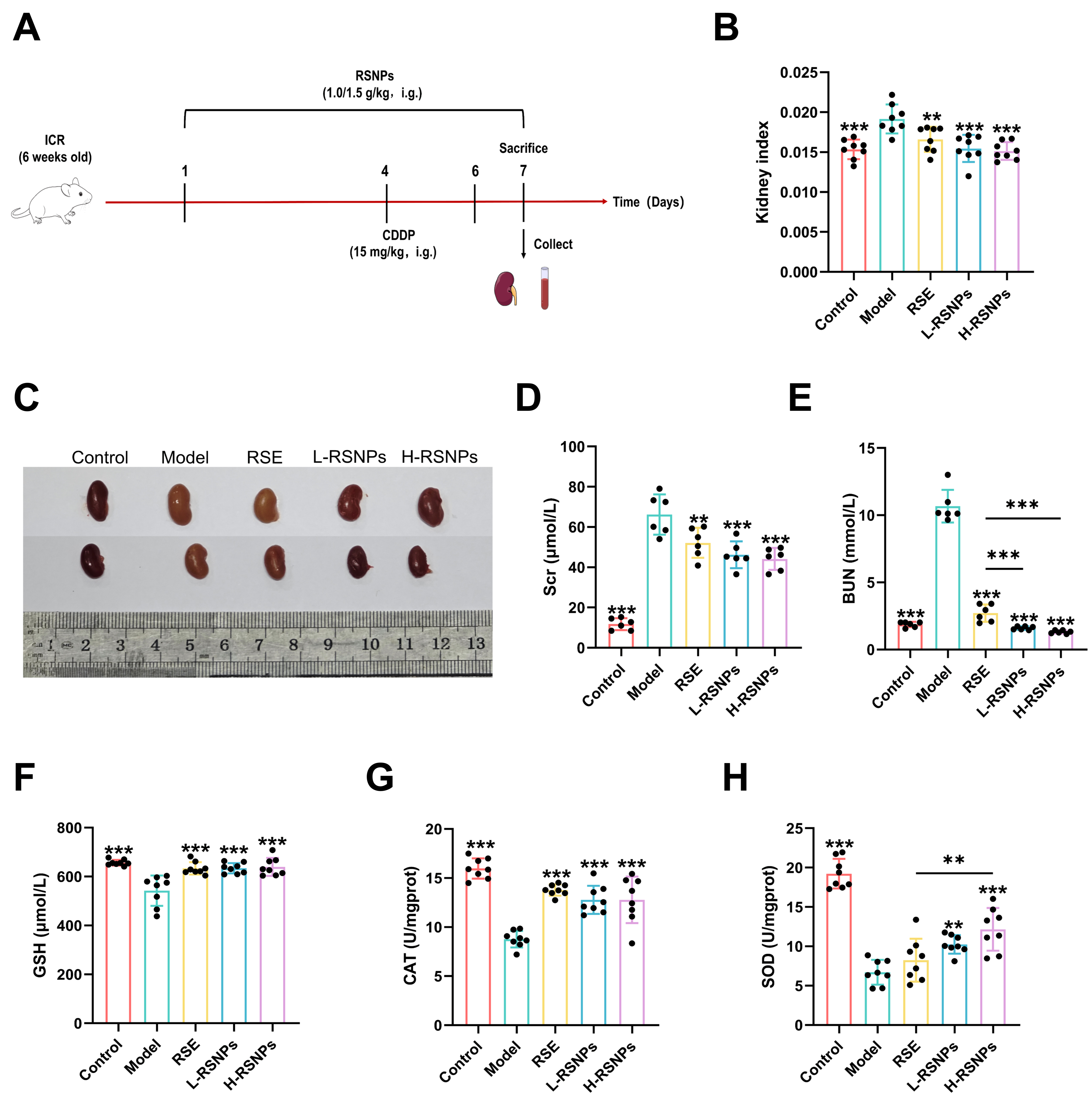 Based on the renal-targeting characteristics of RSNPs, we further assessed their prophylactic efficacy in an established mouse model of CDDP-induced nephrotoxicity. Mice were pretreated for 7 days with low-dose (1.0 g/kg) or high-dose (1.5 g/kg) RSNPs, using conventional RSE (1.5 g/kg) as a reference control, before receiving a single nephrotoxic dose of CDDP (15 mg/kg, i.p.).