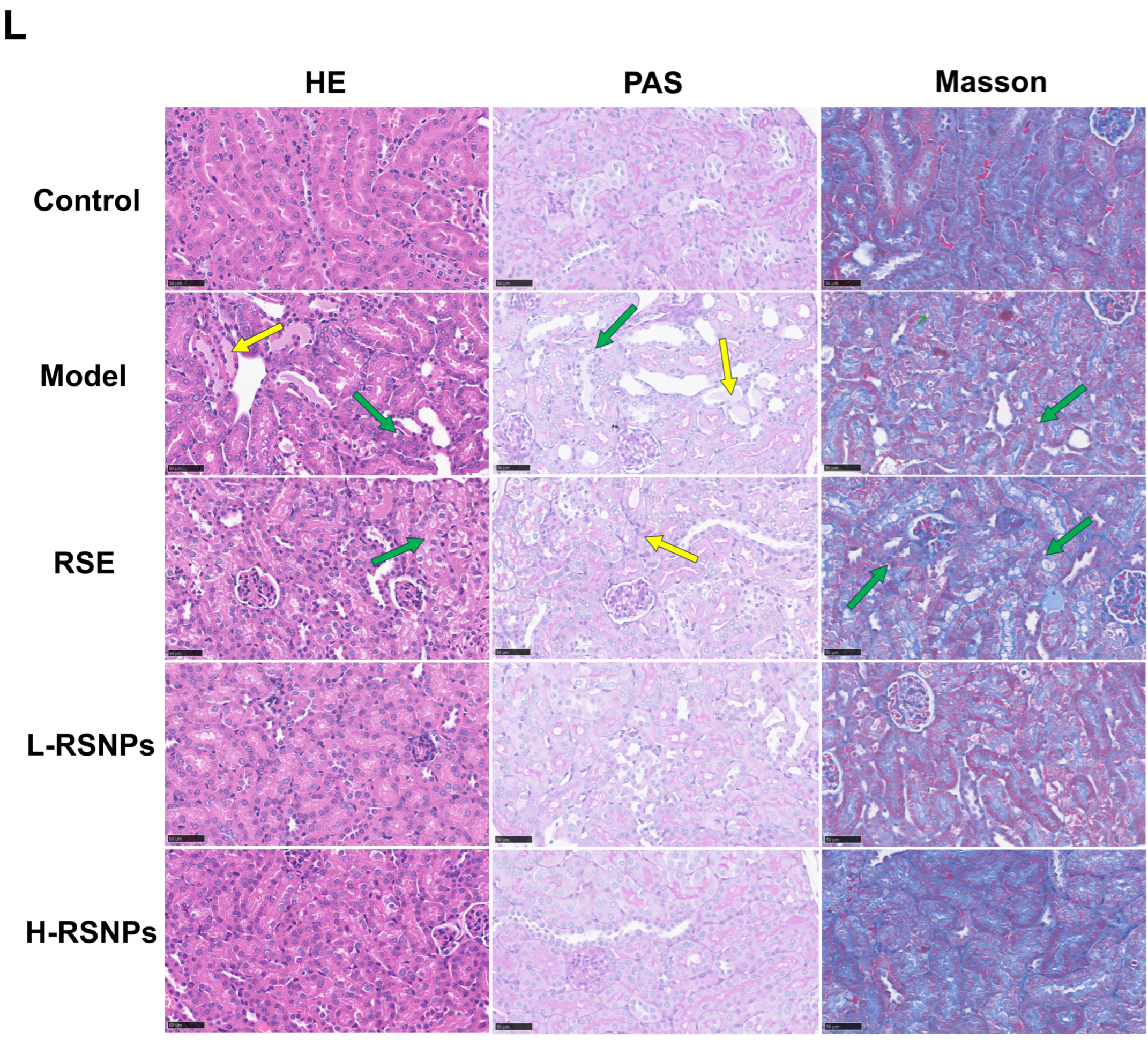 Figure 8I–K). Histopathological evaluation provided structural confirmation of this protection: H&E and PAS staining revealed that RSNPs pretreatment significantly attenuated tubular injury, including epithelial degeneration and cast formation, in a dose-related manner. Masson’s trichrome staining further demonstrated preserved basement membrane architecture, indicating structural integrity was maintained against CDDP-induced damage (