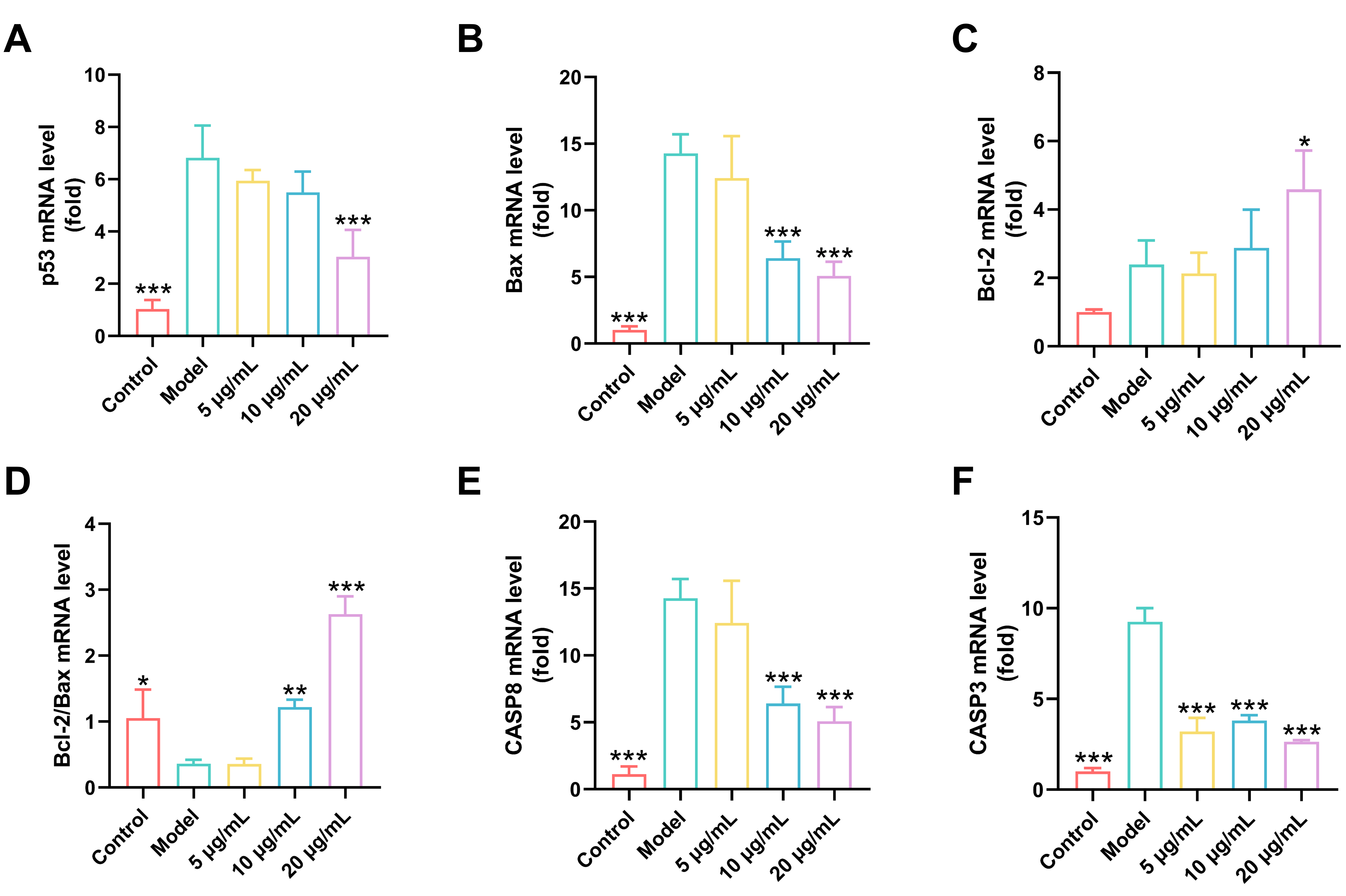 Figure 10A–D). Specifically, we detected increased expression of the pro-apoptotic protein Bax alongside downregulation of the anti-apoptotic factor Bcl-2, leading to a markedly reduced Bcl-2/Bax ratio. These changes further propagated through the apoptotic cascade, as indicated by upregulation of both initiator (CASP8) and executioner (CASP3) caspases at the mRNA level (