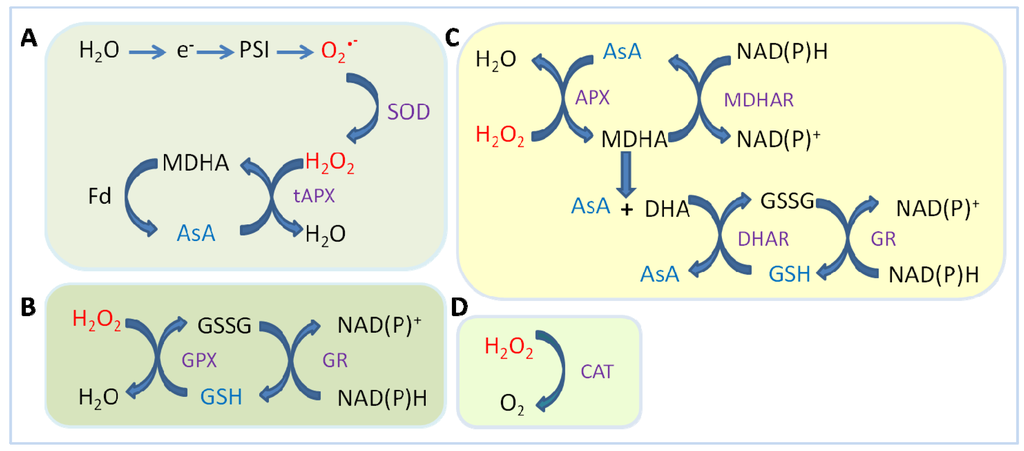 Ascorbate peroxidases (EC: 1.11.1.11) catalyze the reduction of hydrogen peroxide to water by using ascorbate as the electron donor. Consequently, APX plays a role similar to that of CAT; however, the two enzymes exhibit distinctive features. APX utilizes ascorbate (AsA) as specific electron donor to reduce H2O2 to water with the parallel generation of monodehydroascorbate (MDHA), a univalent oxidant of ascorbate. MDHA is spontaneously disproportionated to AsA and dehydroascorbate (DHA). DHA reductase (DHAR) utilizes glutathione (GSH) as an electron donor to regenerate AsA from its oxidized form, DAsA (Figure 2C). Thus, the ascorbate–glutathione cycle located in the stroma of the chloroplast represents the main pathway to prevent the accumulation of toxic levels of H2O2 in photosynthetic organisms [55,56]. In addition to AsA–GSH, the water–water cycle, because of the electron flow from water in photosystem II (PSII) to water in PSI that occurs in this process across thylakoid membranes, participates in ROS detoxification and the dissipation of excess photon energy (Figure 2A).
