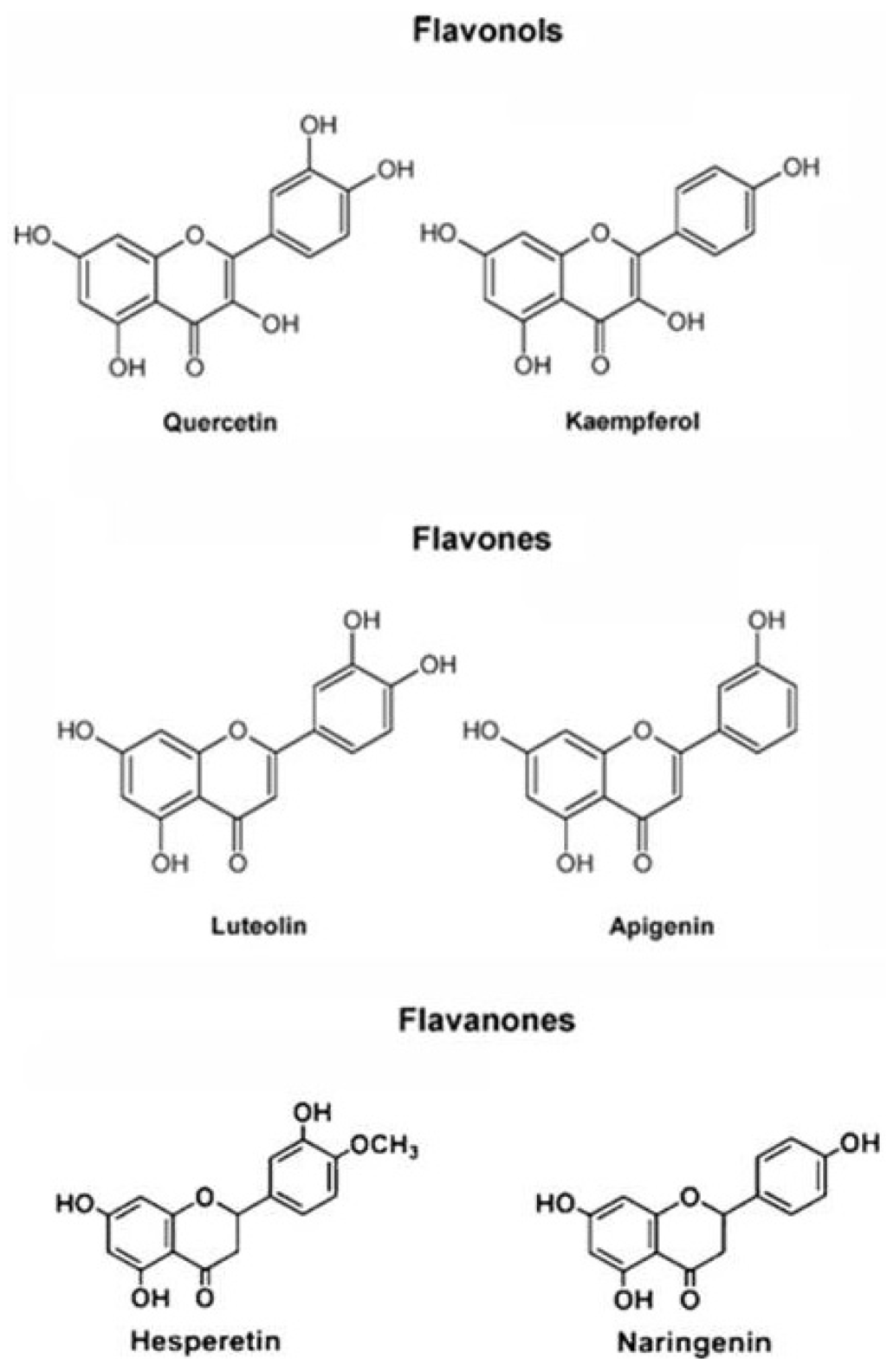 Structures of flavonoids showing differences in B-ring hydroxylation within subclasses.