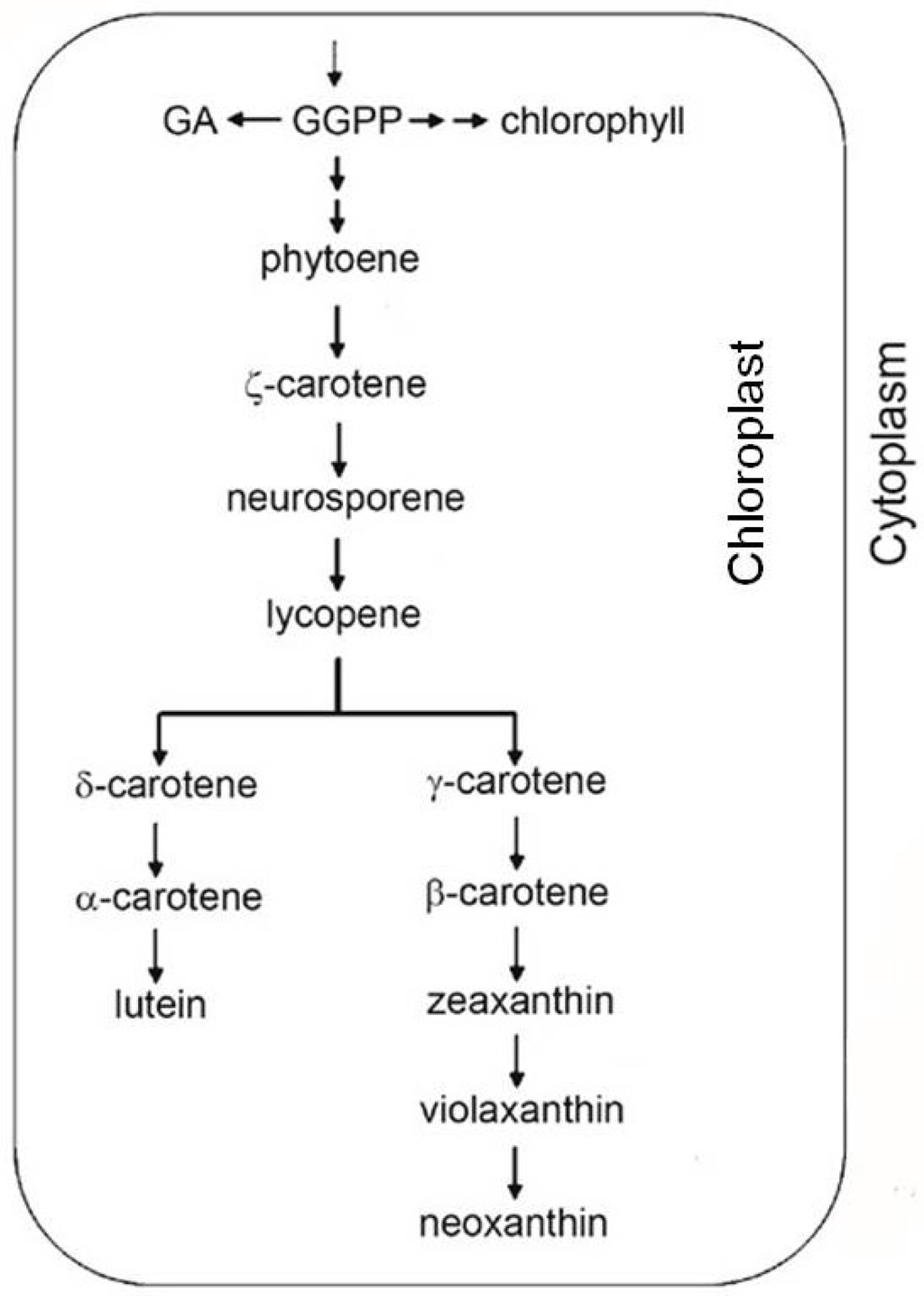 Each enzymatic step from phytoene to lycopene adds one double bound to the molecule. Lycopene is a symmetrical molecule containing 13 double bonds. Enzymatic cyclization of lycopene marks a pathway branching point: one branch leads to β-carotene and its derivative xanthophylls, while the other leads to α-carotene and lutein [87]. The carotenoid biosynthetic pathway has been extensively studied, and all the genes encoding the biosynthetic enzymes have been isolated and characterized from various organisms [88].