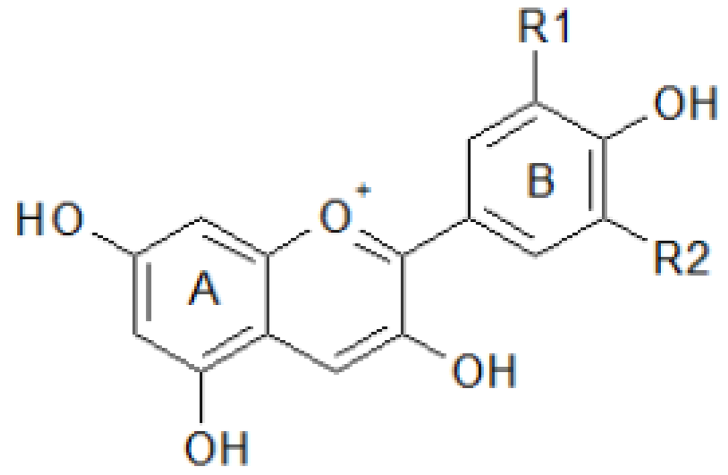 Among the many antioxidant molecules, flavonoids and carotenoids are particularly interesting because they are common in fruits and relevant for human health. Phenolic compounds represent an important class of water soluble antioxidants. They are widespread, often at high levels, in almost all plant foods as flavonoids, tannins, and lignans. The most highly studied of these compounds are the flavonoids—a large class of more than 9000 structurally diverse compounds—which are synthesized by plants via the phenylpropanoid pathway. They include chalcones, flavones, flavonols, flavanones, anthocyanins, and isoflavonoids [82]. The flavonoid basic structure is relatively simple and consists of 15 carbon atoms arranged in two aromatic C6 rings connected by a C3 unit; the rings are labeled A, B and C (Figure 3).