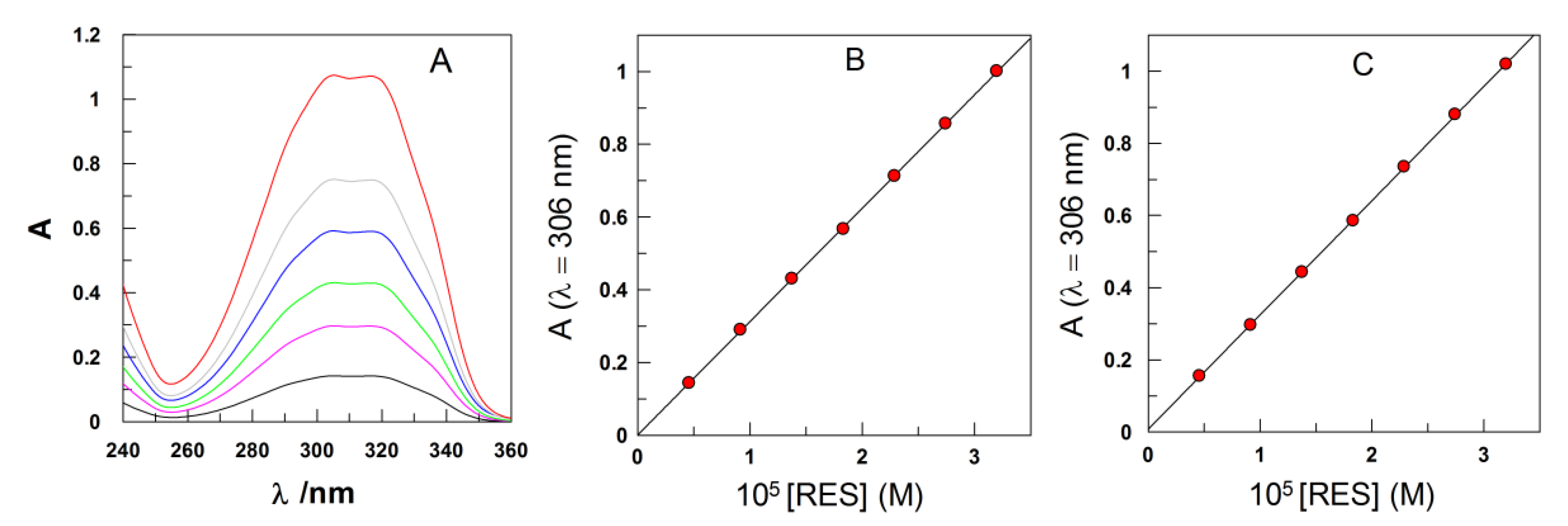 (A) Spectra of RES in water at different [RES]; (B) Beer’s law plot for RES in water (A = (7 ± 27) × 10−4 + (31,187 ± 130) [RES]); (C) calibration curve in a 50:50 (vol:vol) EtOH/BuOH mixture containing 40 µL of corn oil (A = (7.6 ± 2) × 10−4 + (31,682 ± 106) [RES]). Correlation coefficients > 0.999.