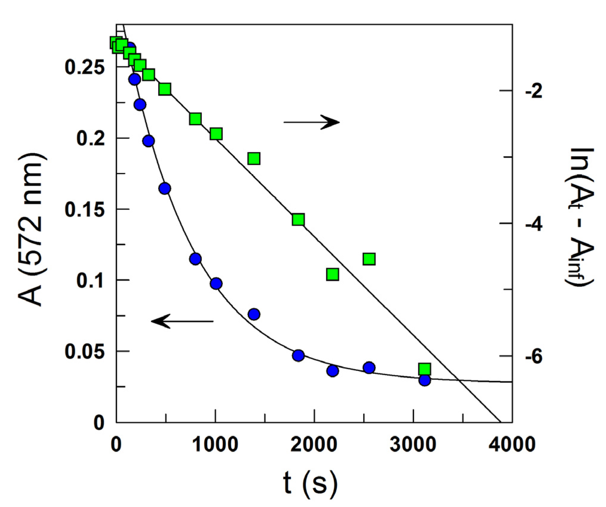 Typical kinetic plot illustrating the determination of kobs for the reaction between 16-ArN2+ and RES in corn oil emulsions from the variation of the absorbance of the azo dye (λ = 572 nm) with time (-