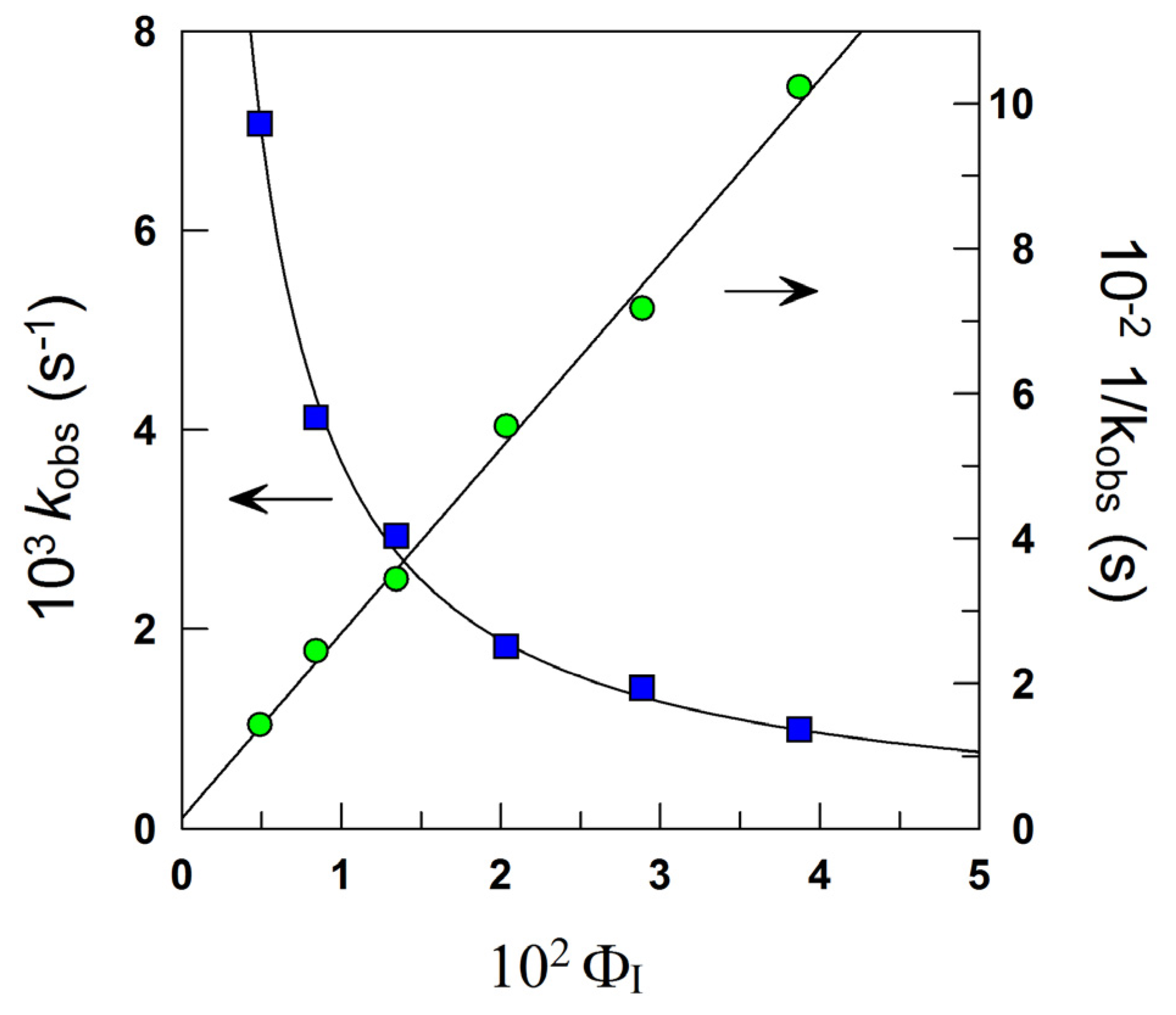 Equation (6) has the same form as Equation (5), where the parameters, a and b, are given by Equations (7) and (8), respectively. They can be determined by linear least squares fitting of the (1/kobs, ФI) pairs of data. The partition constants, POI and PWI, can be obtained by two different methods [19,20]. Here, we determined their value by combining the b parameter (obtained from fits of 1/kobs vs. ФI at constant [REST], ФW and ФO, Equation (9)) with the partition constant between corn oil and water in the absence of emulsifier, PWO, which is numerically equal to the ratio, PWI/POI (Equations (1)–(3)), and solving two equations with two unknowns. Once PWI and POI are known, kI can be determined by using Equation (7) [19].