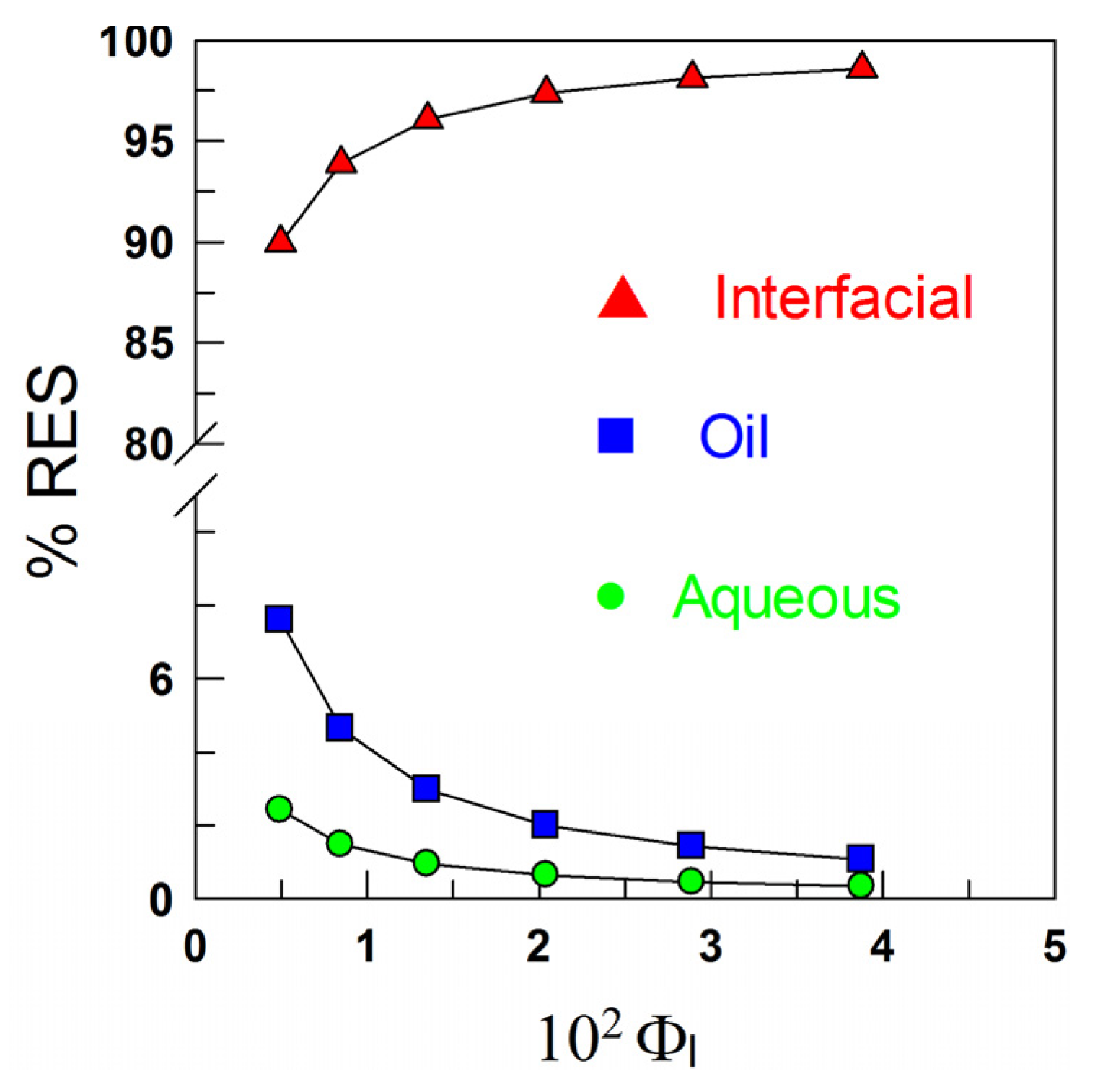 Once the partition constants, PWI and POI, are known, the determination of the percentage of the resveratrol in the oil, aqueous and interfacial regions is straightforward by employing Equations (11)–(13), which have been derived by combining the expressions of partition constants and the mass balance equations. Details can be found elsewhere [19]. Figure 4 shows the distribution of RES in corn oil emulsions as a function of the emulsifier volume fraction. RES is primarily located in the interfacial region of the corn oil emulsions, %RESI = 90% at ФI = 0.005, and this percentage increases to %RESI = 99% at ФI = 0.04. That is, RES is primarily located in the interfacial region of the emulsion at the lowest ФI, and its percentage only increases ~10% upon increasing the interfacial volume eight-fold.