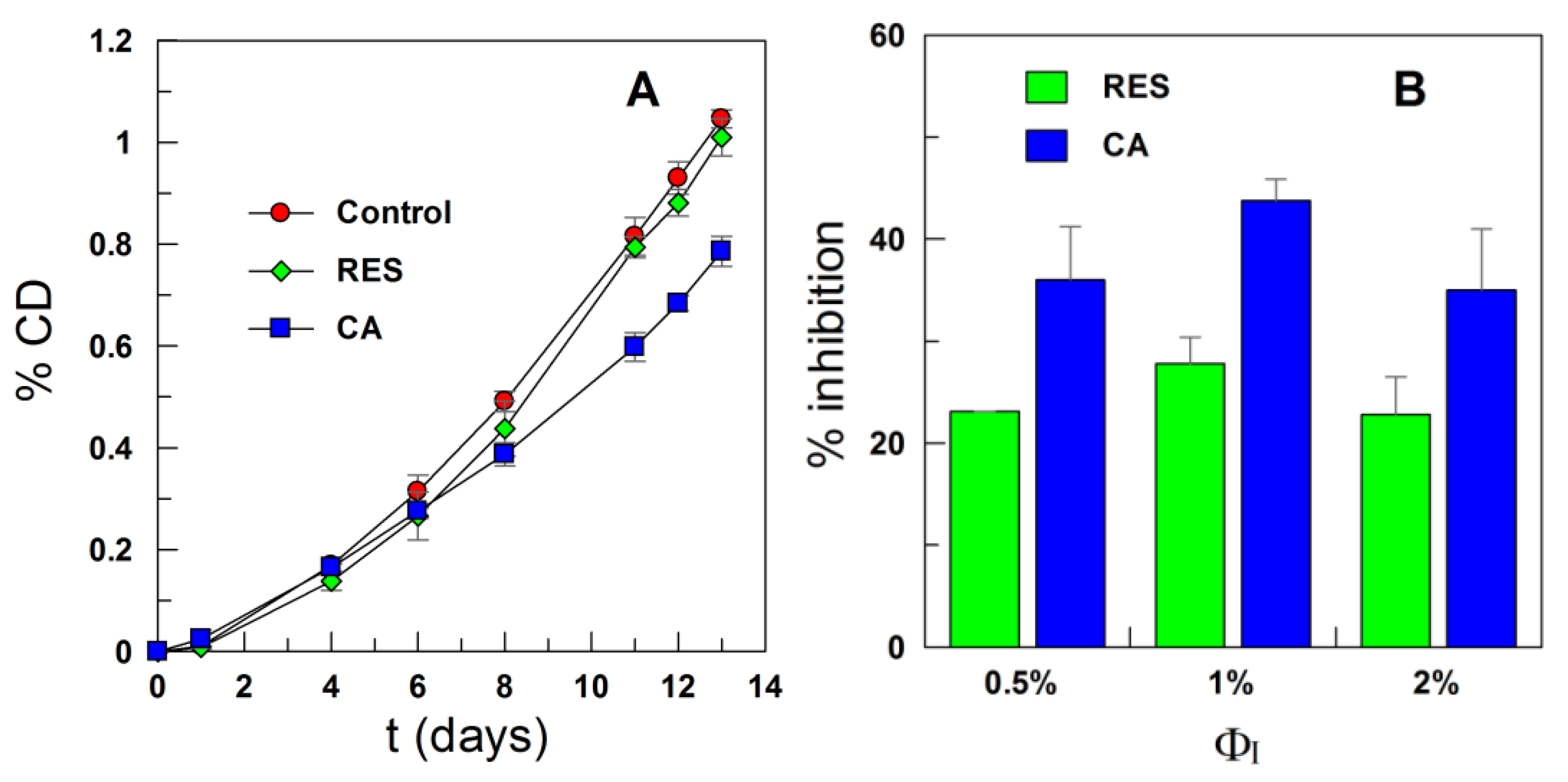 (A) Oxidative stability of stripped corn oil in water emulsions (4:6) obtained in the presence of RES and caffeic acid (CA) as determined by the change in the formation of conjugated dienes with the time at T = 55°C; and (B) inhibition by RES and CA on the formation of conjugated dienes in stripped corn oil emulsions during oxidation at T = 55 °C. Values were taken on Day 13. The percentage of inhibition was calculated as % Inhibition = [(C − S)/C] × 100, where C is the increment in the %CD (conjugated dienes) of the control and S is the increment in the %CD of emulsions in the presence of antioxidant (AO; [AO] = 0.6 mM in the corn oil and FTween 20 = 0.01).