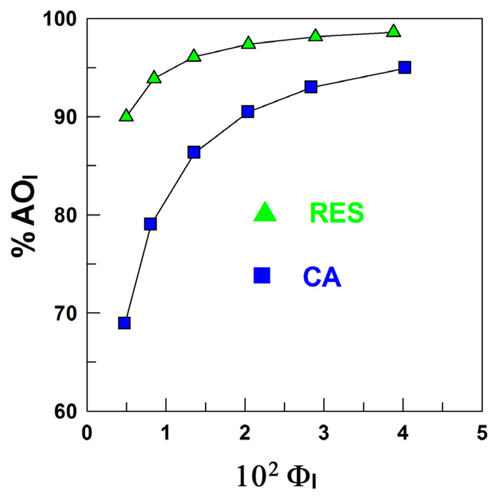 As shown in Figure 5A, the effect of RES in inhibiting the oxidation of emulsified corn oil lipids is negligible. The results may be surprising, because the distribution experiments show that more than 90% of RES is located in the interfacial region of the emulsions (Figure 4), and we demonstrated in recent work [13,30] that for a series of gallate and caffeate alkyl esters, the AO with the highest percentage in the interfacial region (the butyl and octyl ester respectively) is the one which shows the highest antioxidant efficiency. To rationalize this observation and for comparative purposes, we investigated the efficiency of caffeic acid, because we previously determined its distribution in emulsions of the same composition [30]. Figure 5 shows that CA is more efficient than RES and appreciably inhibits the oxidation of the emulsions at any selected emulsifier volume fraction, in spite of the much lower fraction of CA in the interfacial region of emulsions when compared with that of RES (Figure 6).
