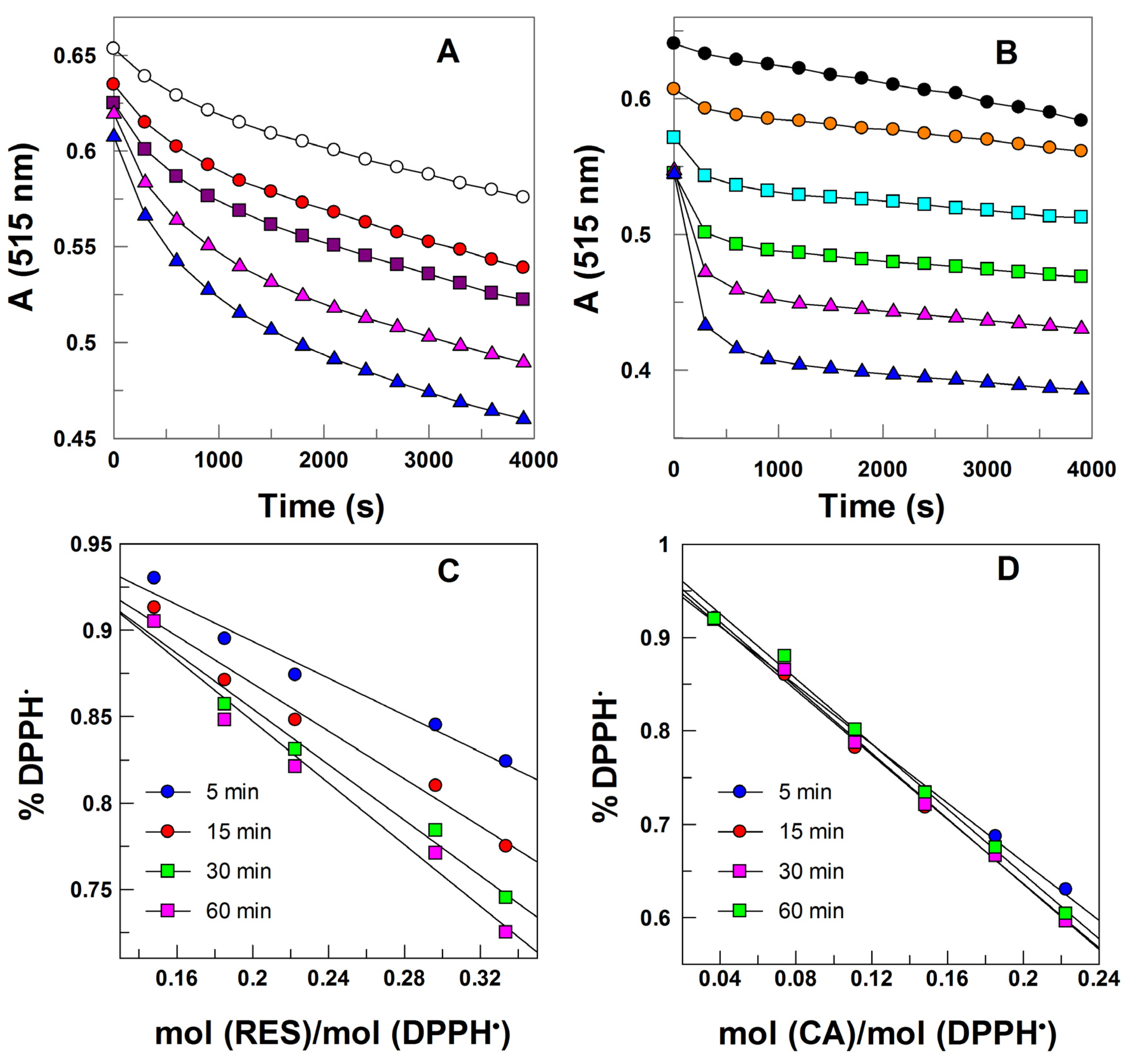 - 0.3337 mol RES/mol DPPH); (B) variation of the absorbance of DPPH in the presence of different concentrations of CA at T = 25 °C (-●- 0.0371 mol RES/mol DPPH, -