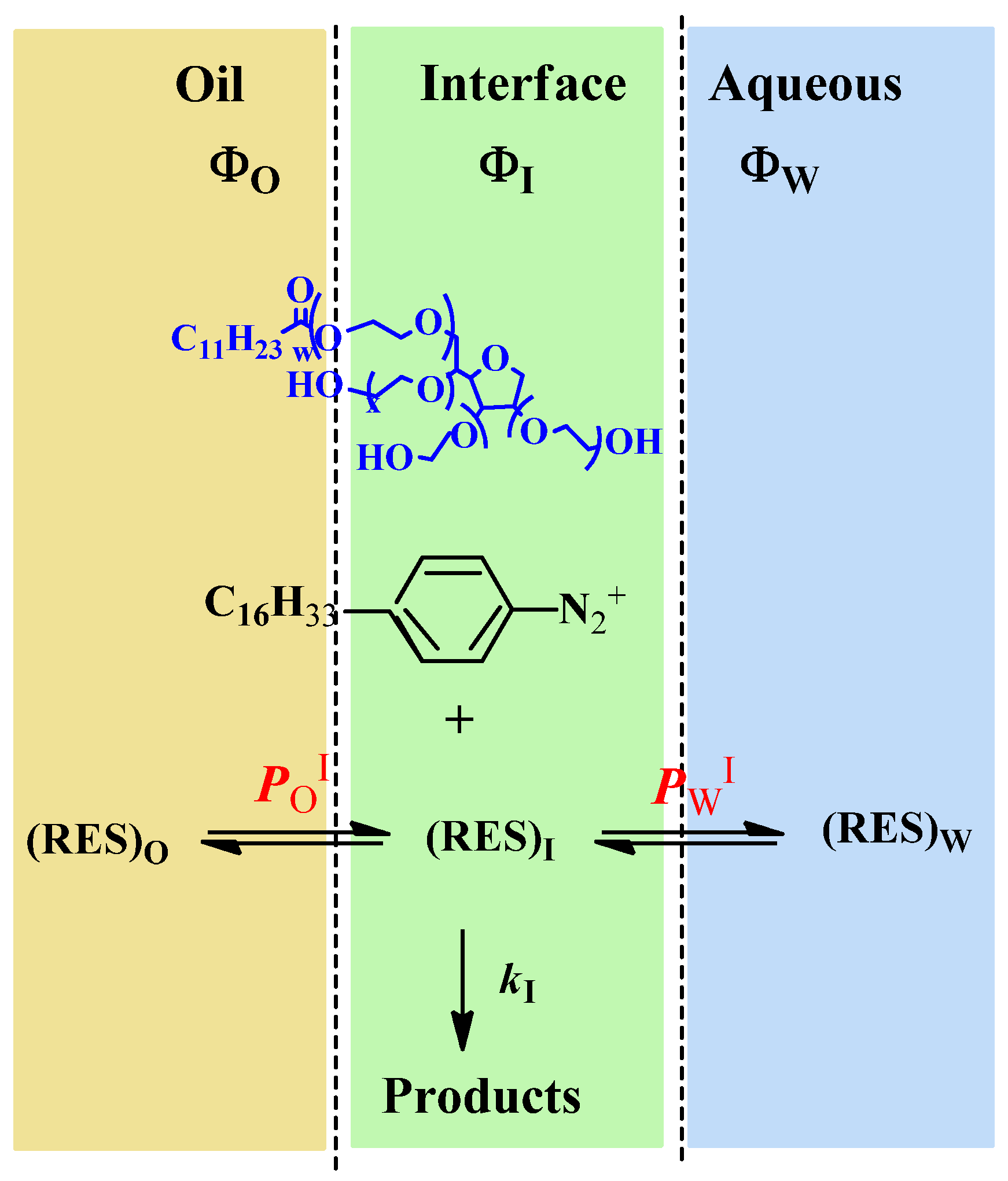 The reaction between 16-ArN2+ and RES in each region of an emulsion is the product of the second-order rate constant and the concentration of each reactant in that region in moles per liter of region volume [19]. 16-ArN2+ has a long hydrophobic alkyl chain and a cationic headgroup and is both water and oil insoluble. Its reactive-N2+ group is located in the interfacial region, where it reacts with RES, as illustrated in Scheme 2, and its concentration in the oil and water regions can be considered negligible. Under pseudo-first order conditions (being [RES] much higher than [16-ArN2+]), the observed rate, kobs, is given by Equation (4) [19].