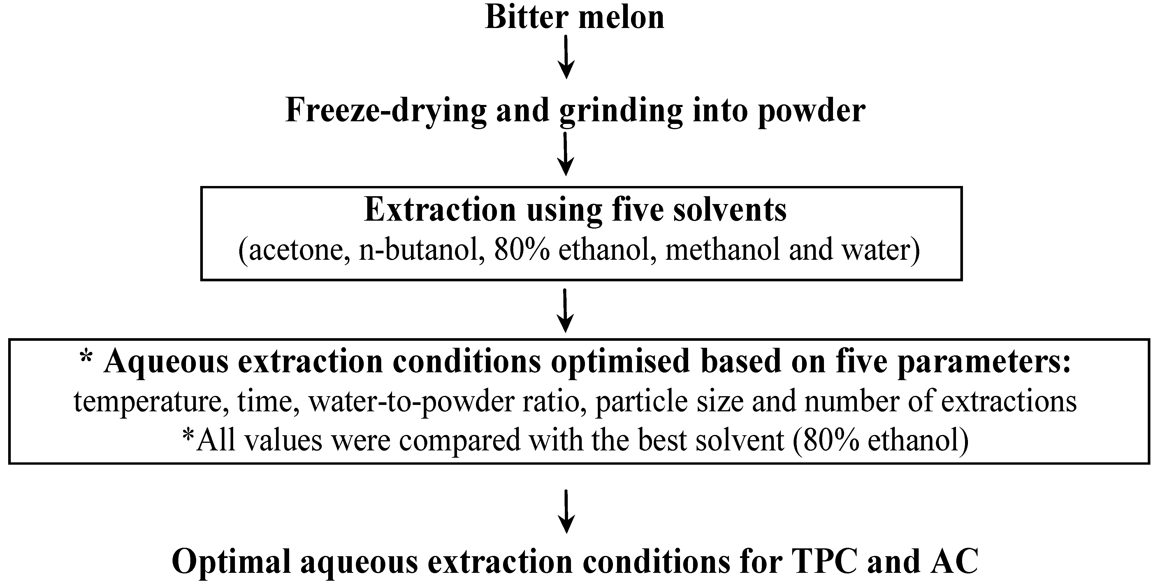 To our knowledge, no published study has comprehensively investigated and optimised the aqueous extraction of phenolic compounds and their associated antioxidant activities from bitter melon and compared the optimised aqueous extraction of these compounds with that achieved with organic solvents. Therefore, this study aimed to maximise the aqueous extraction of the phenolic compounds from freeze-dried and powdered bitter melon and to compare the optimised aqueous extract with that obtained with the best organic solvent from methanol, 80% ethanol, butanol and acetone.