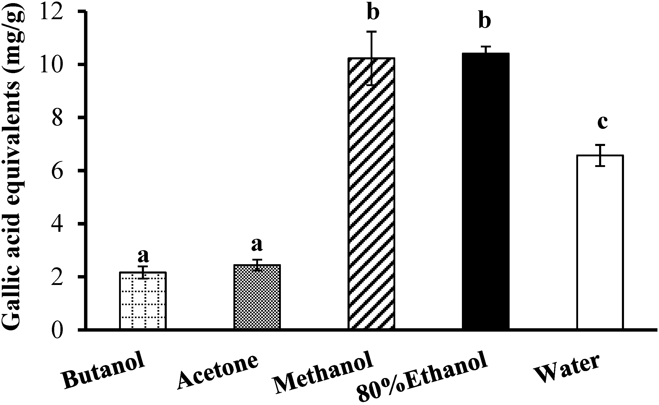 Total phenolic content of bitter melon extracts obtained with five solvents. Values are means ± standard deviations (n = 3) and those not sharing a superscript letter are significantly different (p < 0.05) from each other.