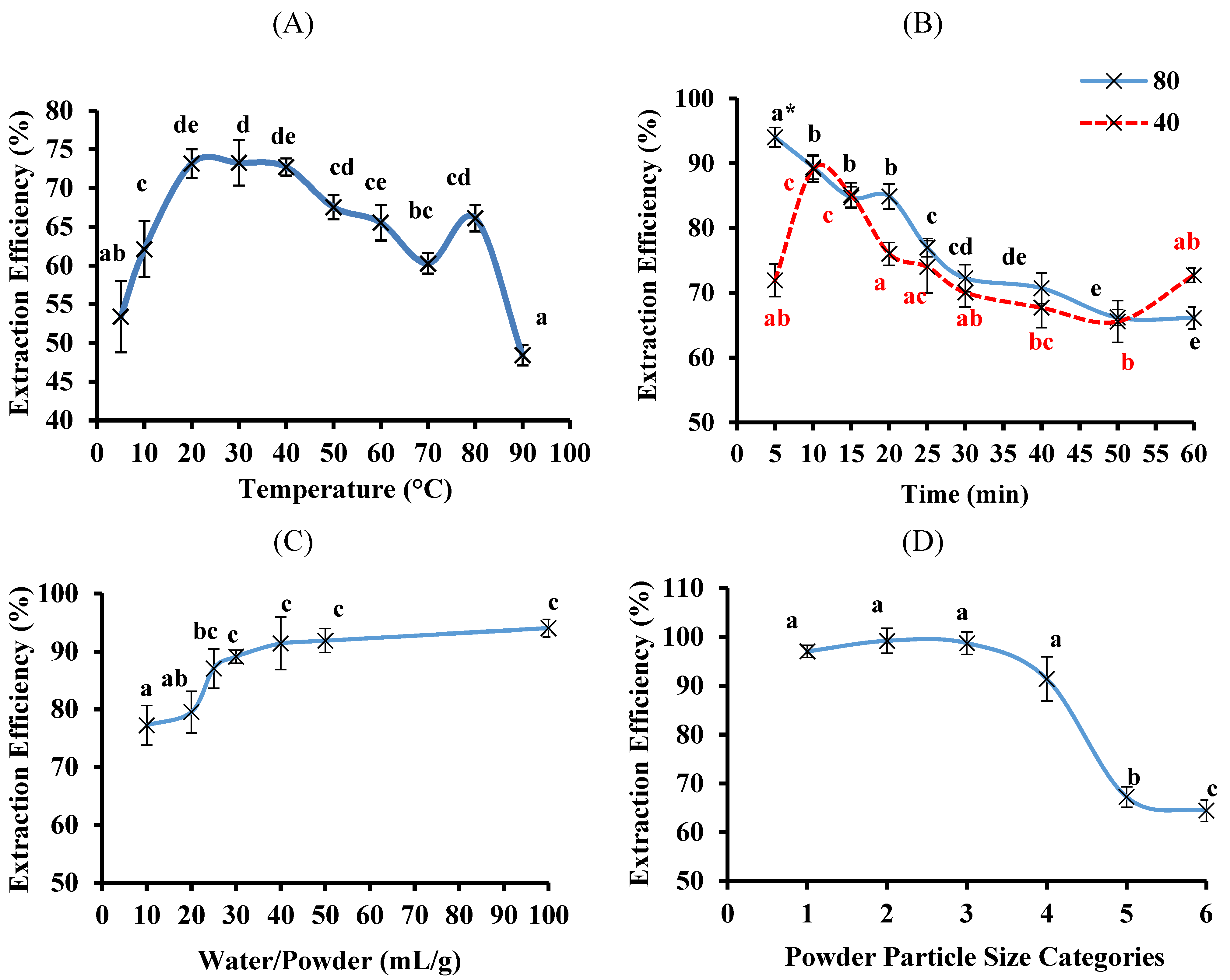 The extraction efficiency for phenolic compounds from bitter melon using water. The aqueous extraction was optimised using one-variable-at-a-time method and each variable was tested in sequential order: (A) temperature; (B) time; (C) water-to-powder ratio; (D) powder particle size and (E) number of times the same sample is extracted. The powder particle size categories were: (1) <0.25, (2) 0.25–0.05, (3) 0.5–1.0, (4) 1.0–2.0, (5) 2.0–2.8 and (6) >2.8 mm. The extraction efficiency was relative to the 80% ethanol extract and data are means ± standard deviations (n = 3) and those not sharing a letter are significantly different (p < 0.05) from each other. * This value is also significantly different (p < 0.05) from the values obtained at 40 °C.