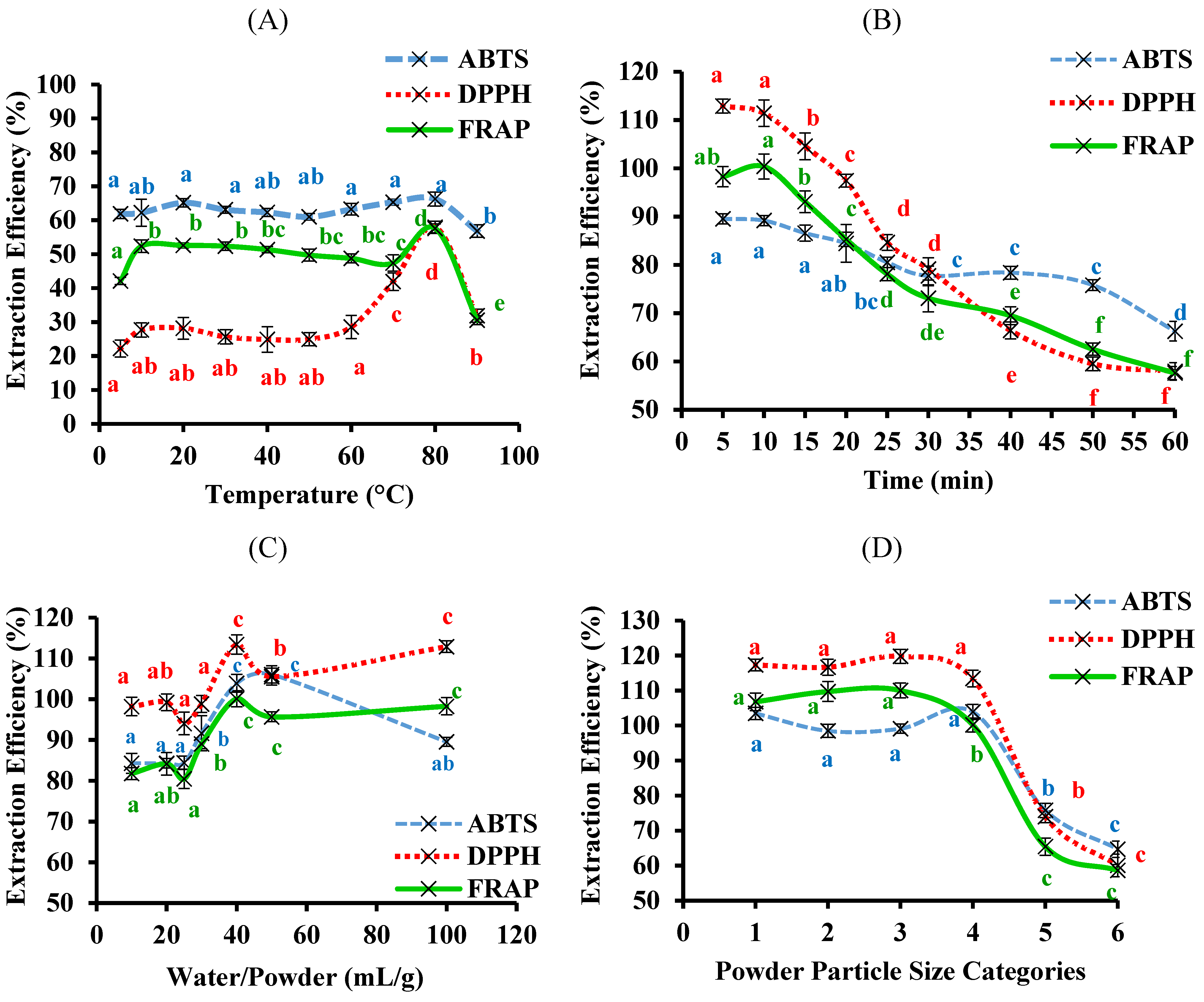 The extraction efficiency for antioxidant capacity from bitter melon using water. The aqueous extraction was optimised using one-variable-at-a-time method and each variable was tested in sequential order: (A) temperature; (B) time; (C) water-to-powder ratio; (D) powder particle size and (E) number of times the same sample is extracted. The powder particle size categories were: (1) <0.25, (2) 0.25–0.05, (3) 0.5–1.0, (4) 1.0–2.0, (5) 2.0–2.8 and (6) >2.8 mm. The extraction efficiency was relative to the 80% ethanol extract and data are means ± standard deviations (n = 3) and those not sharing a letter are significantly different (p < 0.05) from each other.