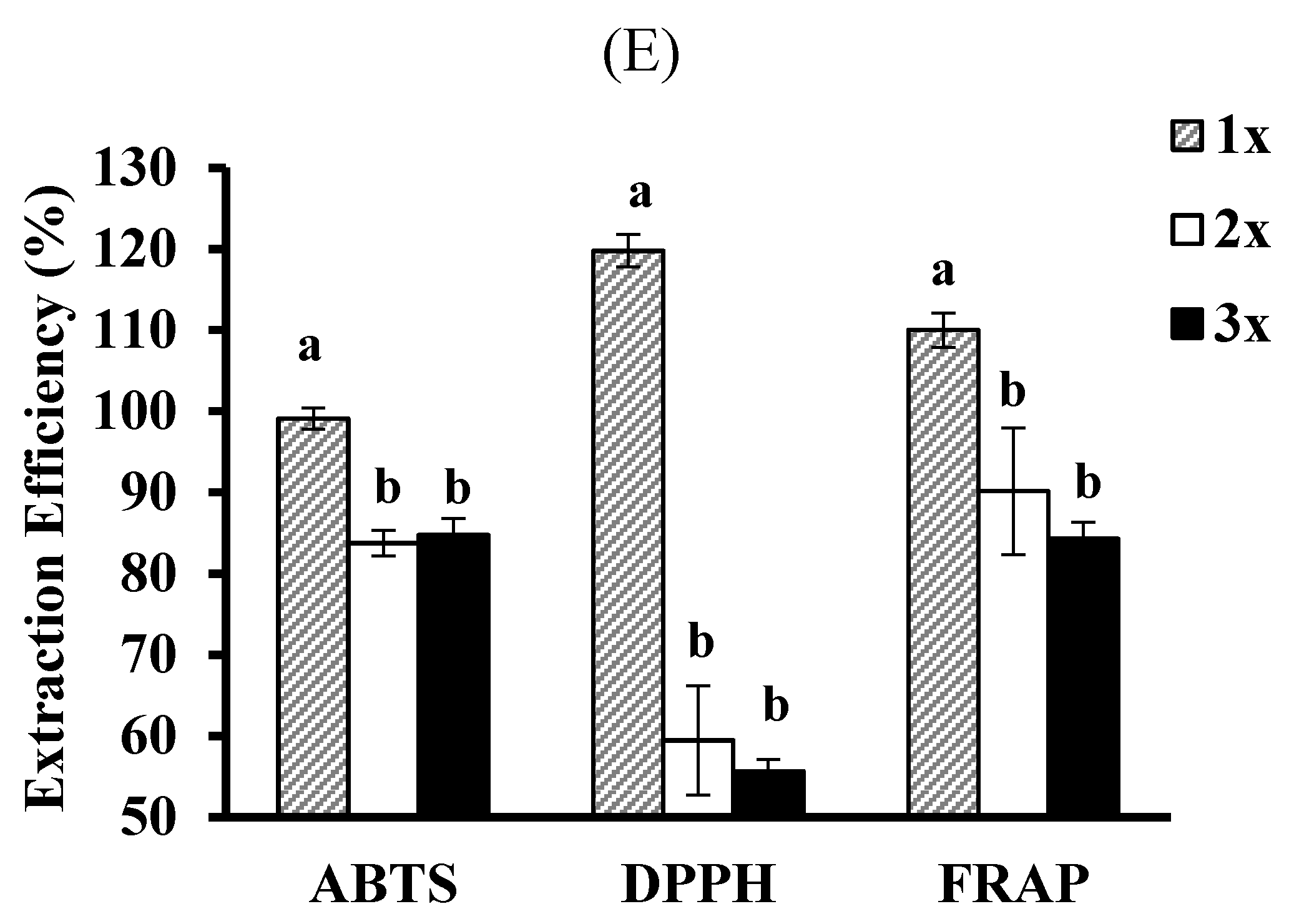 The extraction efficiency for the aqueous extractions, with respect to their TPC and AC, was calculated and expressed as a percentage of the 80% ethanol (EtOH) extract as follows: