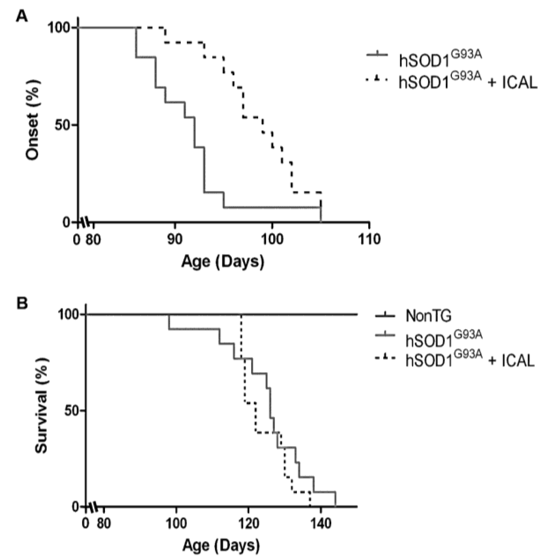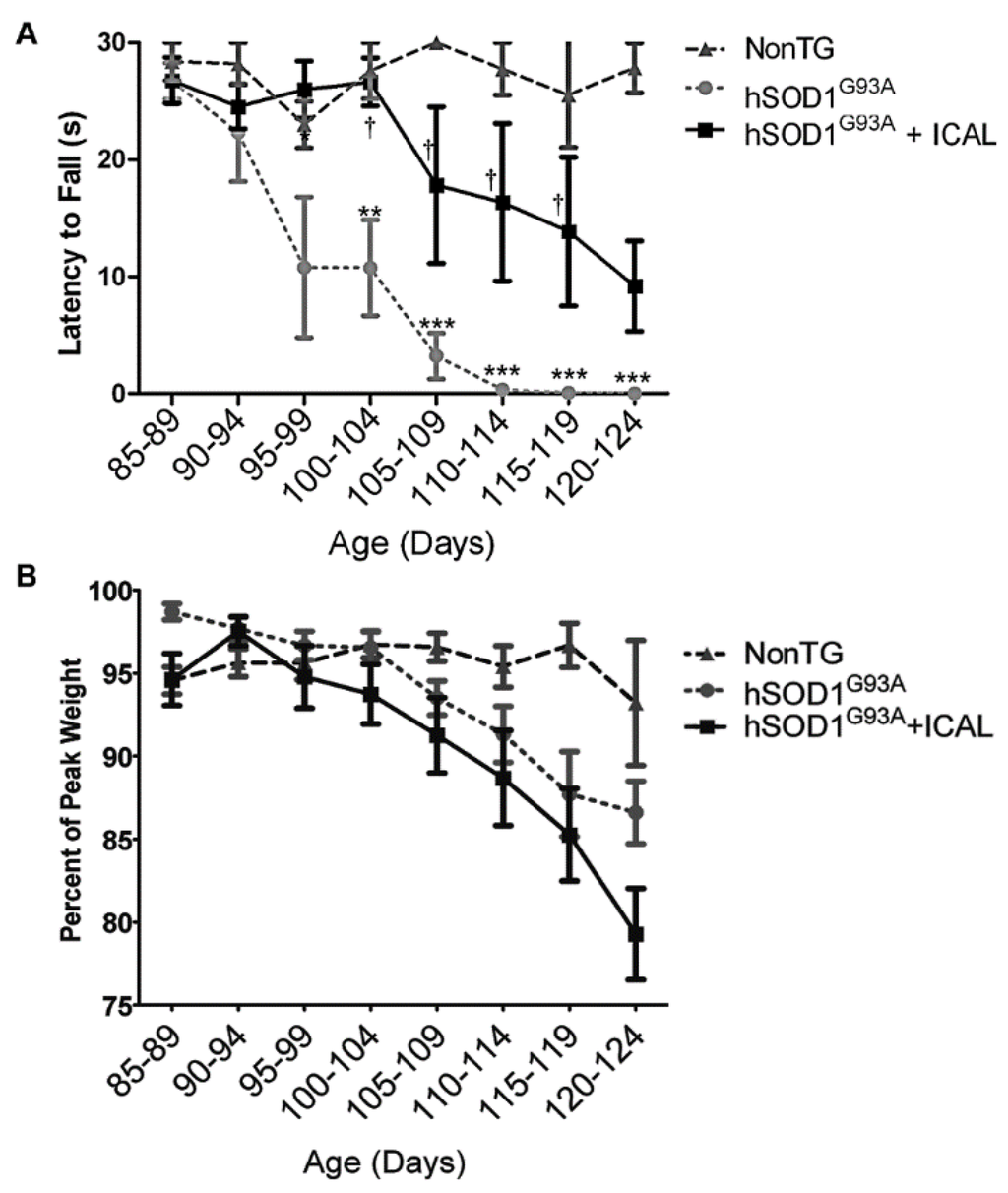 3.1. Immunocal® Delays Disease Onset, but Does Not Extend Lifespan in the hSOD1G93A Mouse Model of ALS