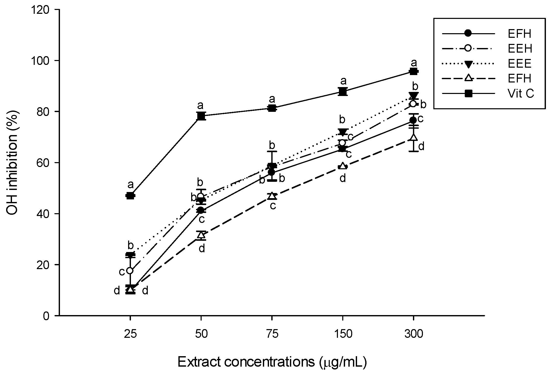 Hydroxyl radical (OH) scavenging potential of the different plant extracts. Values are expressed as mean ± SD of three replicates. In the same concentration the values affected with different letter are significantly different at p < 0.05. EEE: H. zenkeri (bark) ethanolic extract; EFE: H. zenkeri (leaves) ethanolic extract; EEH: H. zenkeri (bark) hydro-ethanolic extract; EFH: H. zenkeri (leaves) hydro-ethanolic extract; Vit C: Vitamin C.