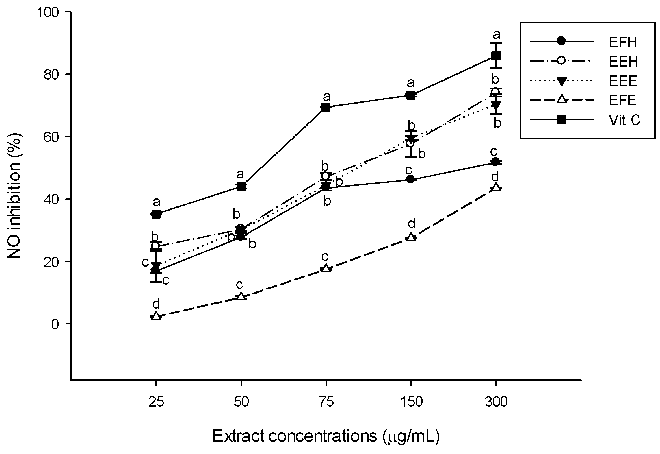 Nitric oxide radical (NO) scavenging potential of the different plant extracts. Values are expressed as mean ± SD of three replicates. In the same concentration the values labeled with different letters differ significantly at p < 0.05. EEE: H. zenkeri (bark) ethanolic extract; EFE: H. zenkeri (leaves) ethanolic extract; EEH: H. zenkeri (bark) hydro-ethanolic extract; EFH: H. zenkeri (leaves) hydro-ethanolic extract; Vit C: Vitamin C.