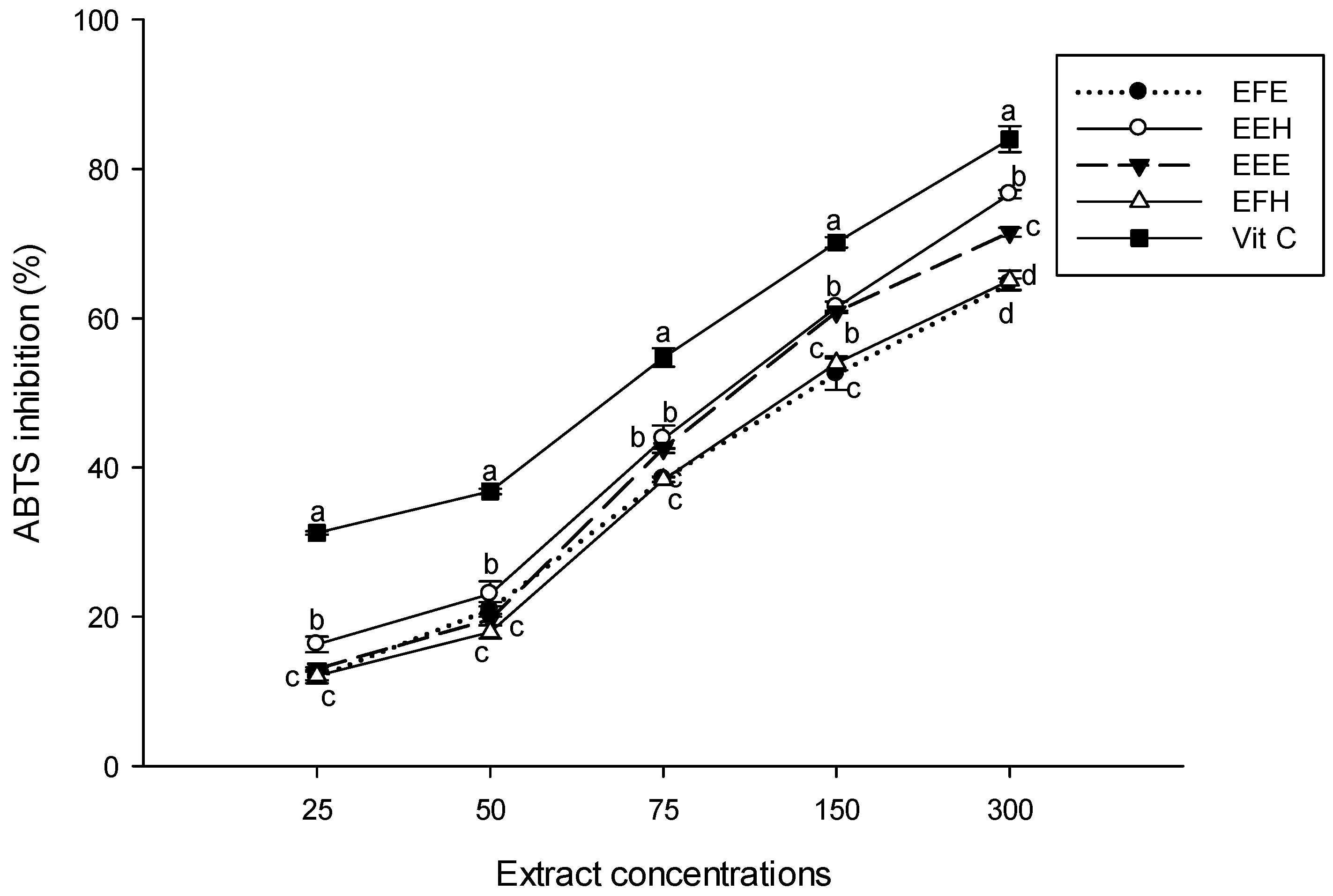 The 2,2-azinobis(3-ethylbenzthiazoline)-6-sulfonic acid (ABTS) scavenging potential of the different plant extracts. Values are expressed as mean ± SD of three replicates. In the same concentration the values labeled with different letters differ significantly at p < 0.05. EEE: H. zenkeri (bark) ethanolic extract; EFE: H. zenkeri (leaves) ethanolic extract; EEH: H. zenkeri (bark) hydro-ethanolic extract; EFH: H. zenkeri (leaves) hydro-ethanolic extract; Vit C: Vitamin C.