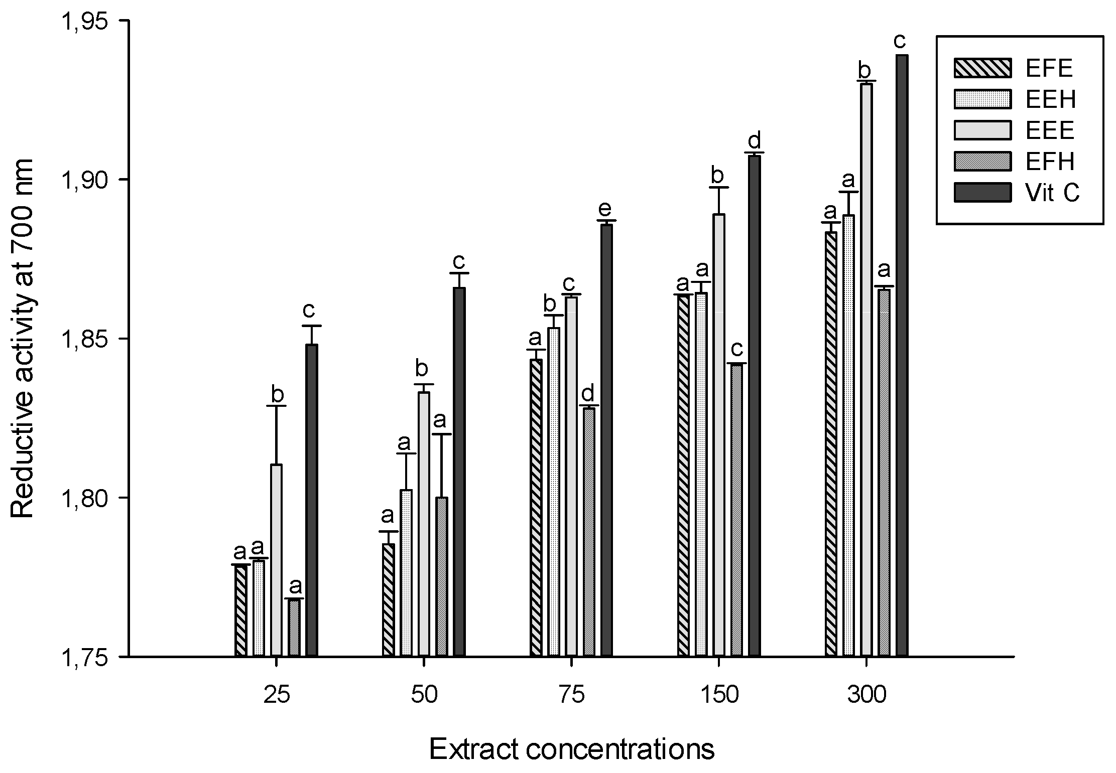 Reductive activity of the different plant extracts. Values are expressed as mean ± SD of three replicates. In the same concentration the values labeled with different letters differ significantly at p < 0.05. EEE: H. zenkeri (bark) ethanolic extract; EFE: H. zenkeri (leaves) ethanolic extract; EEH: H. zenkeri (bark) hydro-ethanolic extract; EFH: H. zenkeri (leaves) hydro-ethanolic extract; Vit C: Vitamin C.