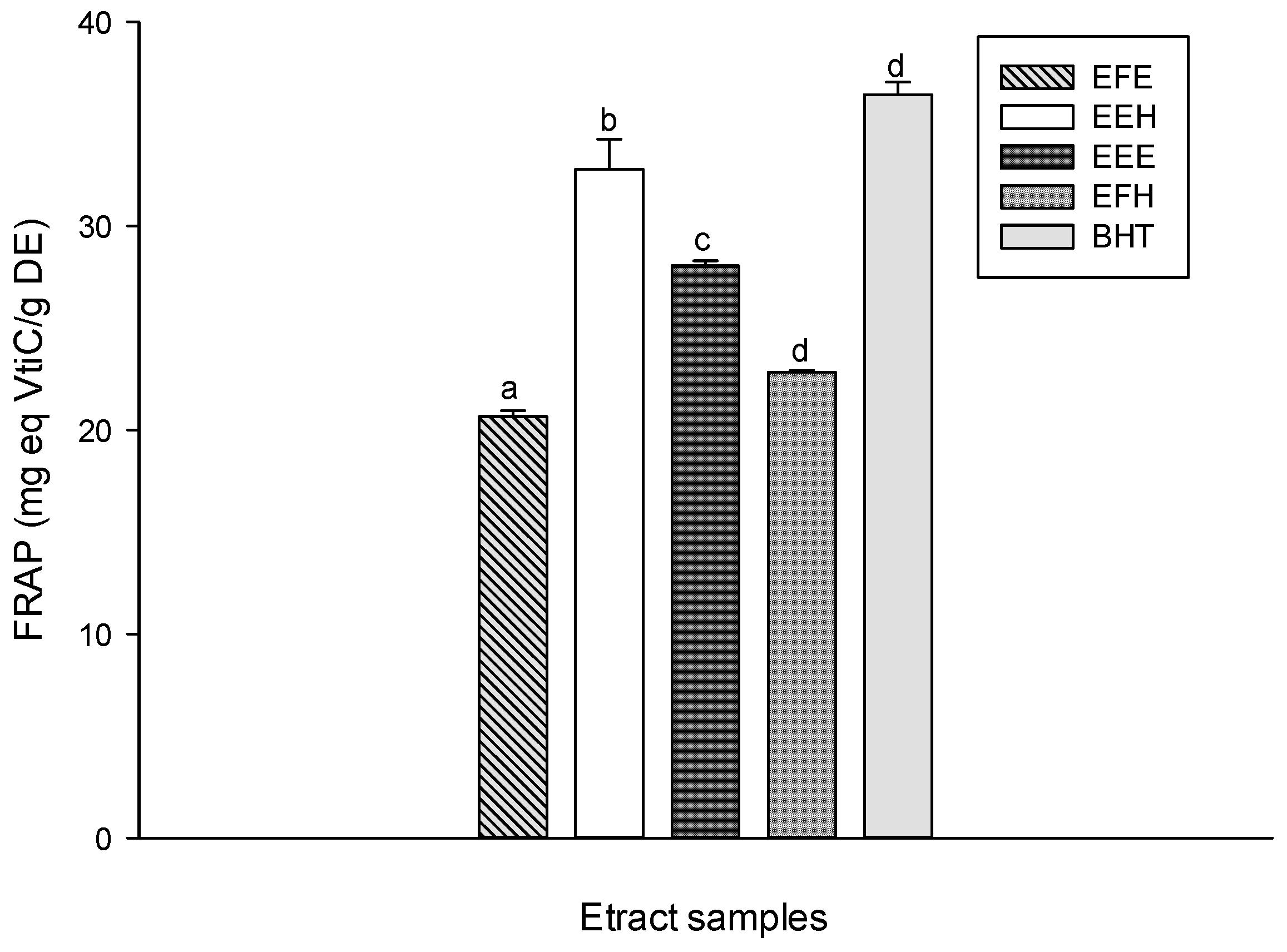 Ferric reducing antioxidant power (FRAP) antioxidant activities of the different plant extracts. Values are expressed as mean ± SD of three replicates. The values labeled with different letters differ significantly different at p < 0.05. EEE: H. zenkeri (bark) ethanolic extract; EFE: H. zenkeri (leaves) ethanolic extract; EEH: H. zenkeri (bark) hydro-ethanolic extract; EFH: H. zenkeri (leaves) hydro-ethanolic extract; BHT: butylated hydroxyl toluene.