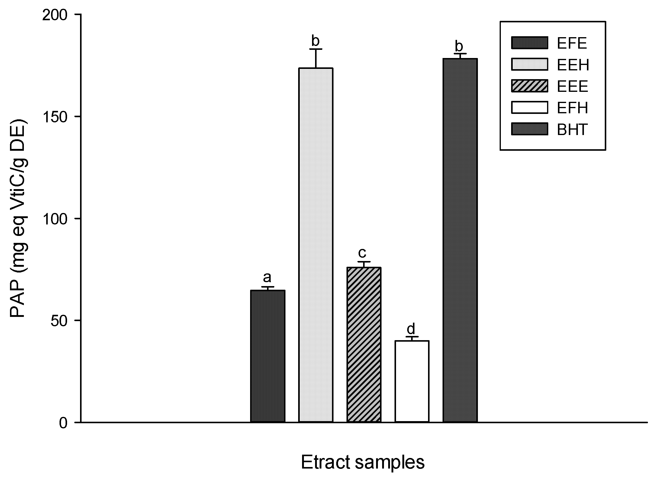 Phosphomolybdenum antioxidative power (PAP) of the different plant extracts. Values are expressed as mean ± SD of three replicates. The values labeled with different letters differ significantly at p < 0.05. EEE: H. zenkeri (bark) ethanolic extract; EFE: H. zenkeri (leaves) ethanolic extract; EEH: H. zenkeri (bark) hydro-ethanolic extract; EFH: H. zenkeri (leaves) hydro-ethanolic extract; BHT: butylated hydroxyl toluene.