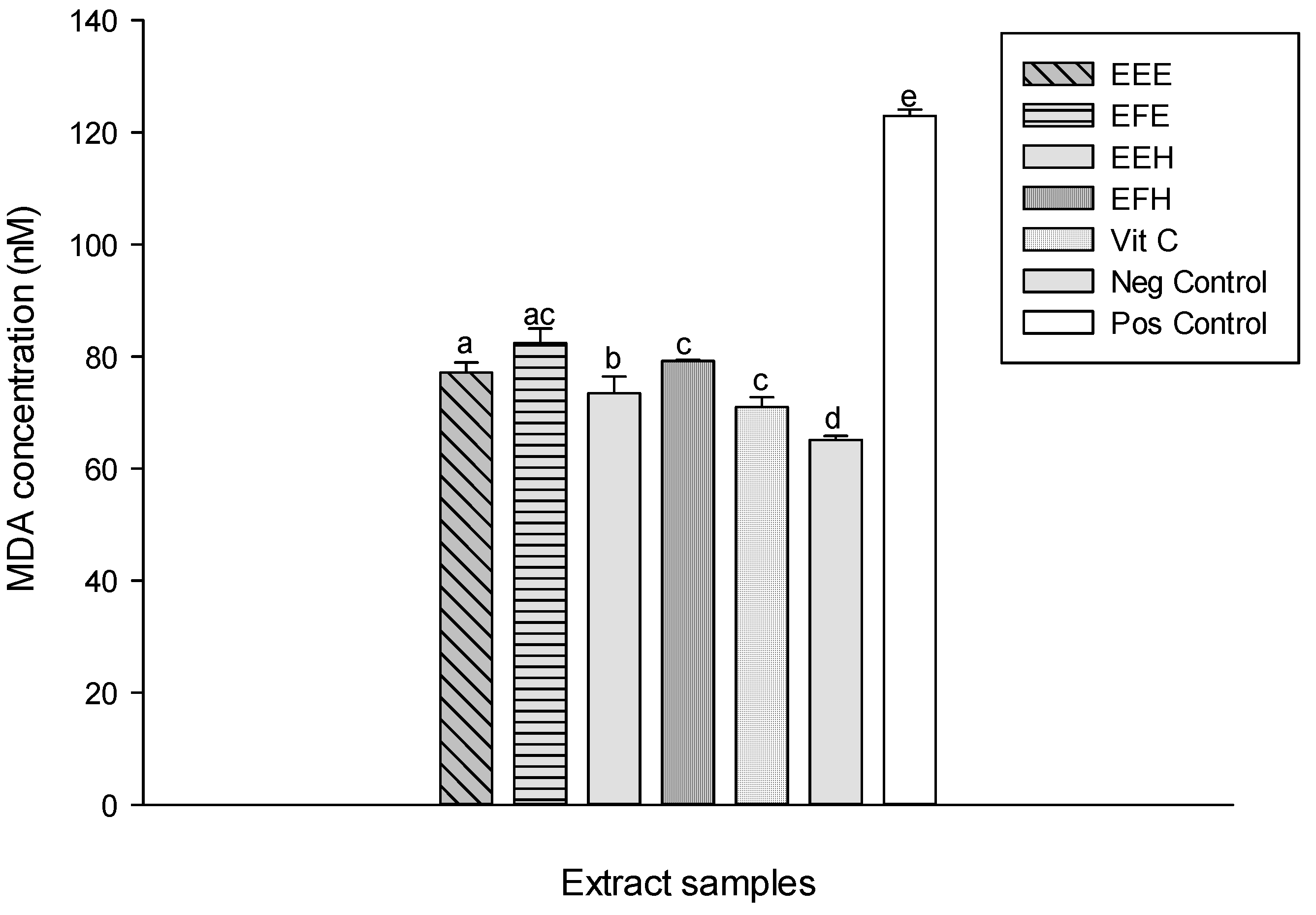 Protective properties of plant extracts against lipid peroxidation. Values are expressed as mean ± SD of three replicates. In the same column the values labeled with different letters differ significantly at p < 0.05. EEE: H. zenkeri (bark) ethanolic extract; EFE: H. zenkeri (leaves) ethanolic extract; EEH: H. zenkeri (bark) hydro-ethanolic extract; EFH: H. zenkeri (leaves) hydro-ethanolic extract; Vit C: Vitamin C. Pos Control: oxidant (positive) control. Neg Control: Normal (negative) control.