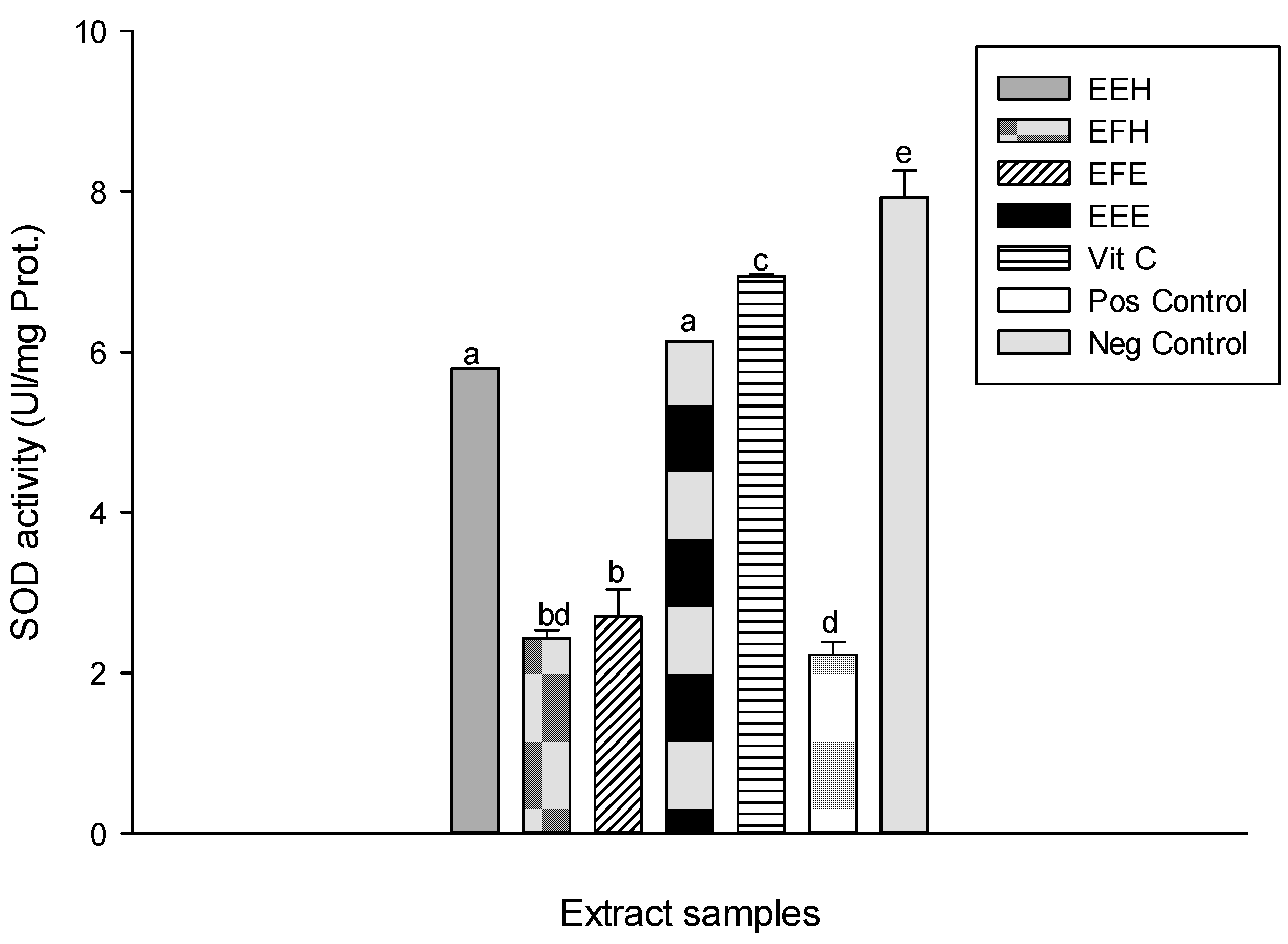 Protective properties of plant extracts: SOD activity. Values are expressed as mean ± SD of three replicates. In the same column the values labeled with different letters differ significantly at p < 0.05. EEE: H. zenkeri (bark) ethanolic extract; EFE: H. zenkeri (leaves) ethanolic extract; EEH: H. zenkeri (bark) hydro-ethanolic extract; EFH: H. zenkeri (leaves) hydro-ethanolic extract; Vit C: Vitamin C. Pos Control: oxidant (positive) control. Neg Control: Normal (negative) control.