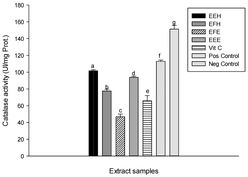 Protective properties of plant extracts: catalase activity. Values are expressed as mean ± SD of three replicates. In the same column the values labeled with different letters differ significantly at p < 0.05. EEE: H. zenkeri (bark) ethanolic extract; EFE: H. zenkeri (leaves) ethanolic extract; EEH: H. zenkeri (bark) hydro-ethanolic extract; EFH: H. zenkeri (leaves) hydro-ethanolic extract; Vit C: Vitamin C. Pos Control: oxidant (positive) control. Neg Control: Normal (negative) control.