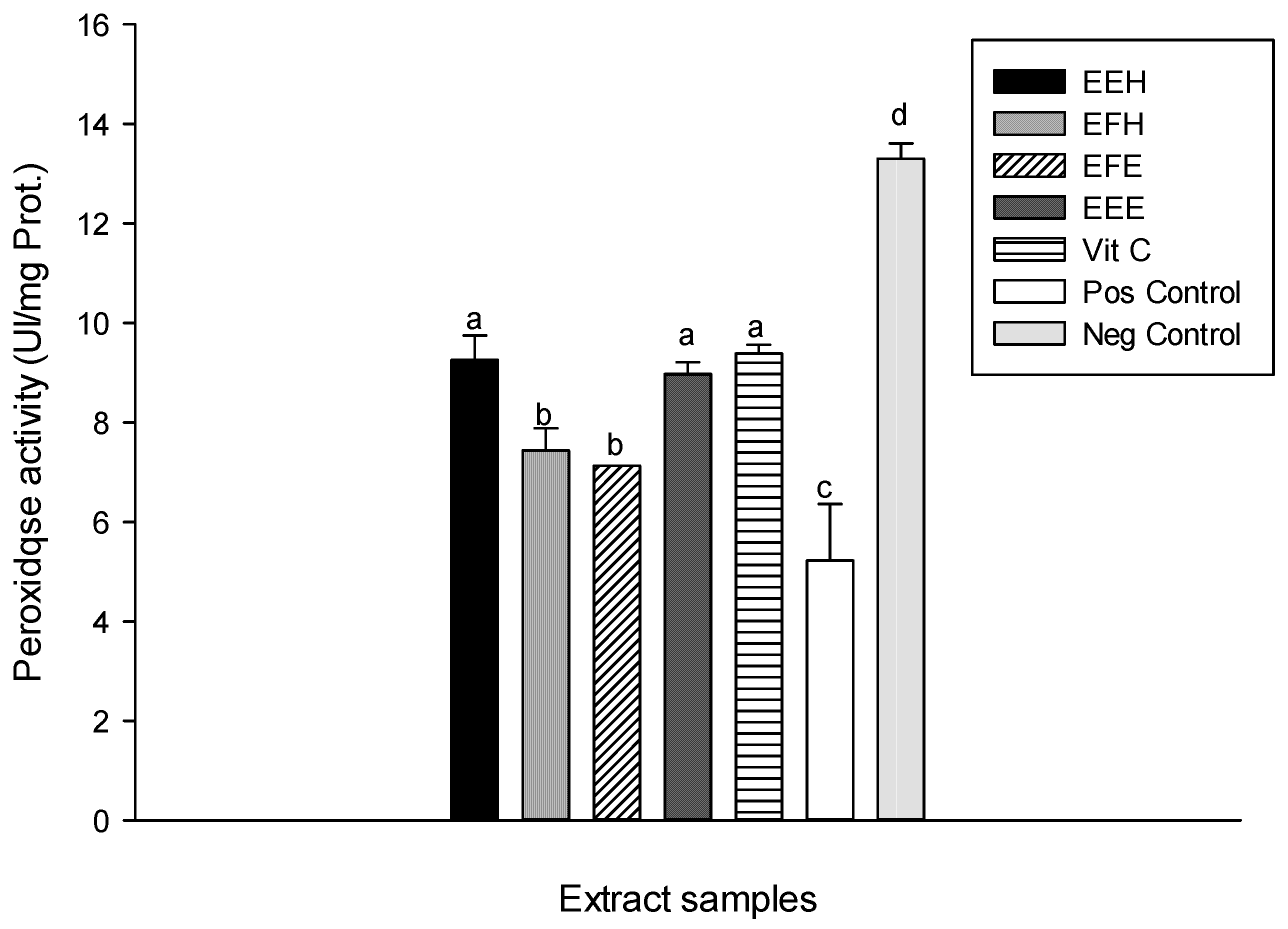Protective properties of plant extracts: peroxidase activity. Values are expressed as mean ± SD of three replicates. In the same column the values labeled with different letters differ significantly at p < 0.05. EEE: H. zenkeri (bark) ethanolic extract; EFE: H. zenkeri (leaves) ethanolic extract; EEH: H. zenkeri (bark) hydro-ethanolic extract; EFH: H. zenkeri (leaves) hydro-ethanolic extract; Vit C: Vitamin C. Pos Control: oxidant (positive) control. Neg Control: Normal (negative) control.