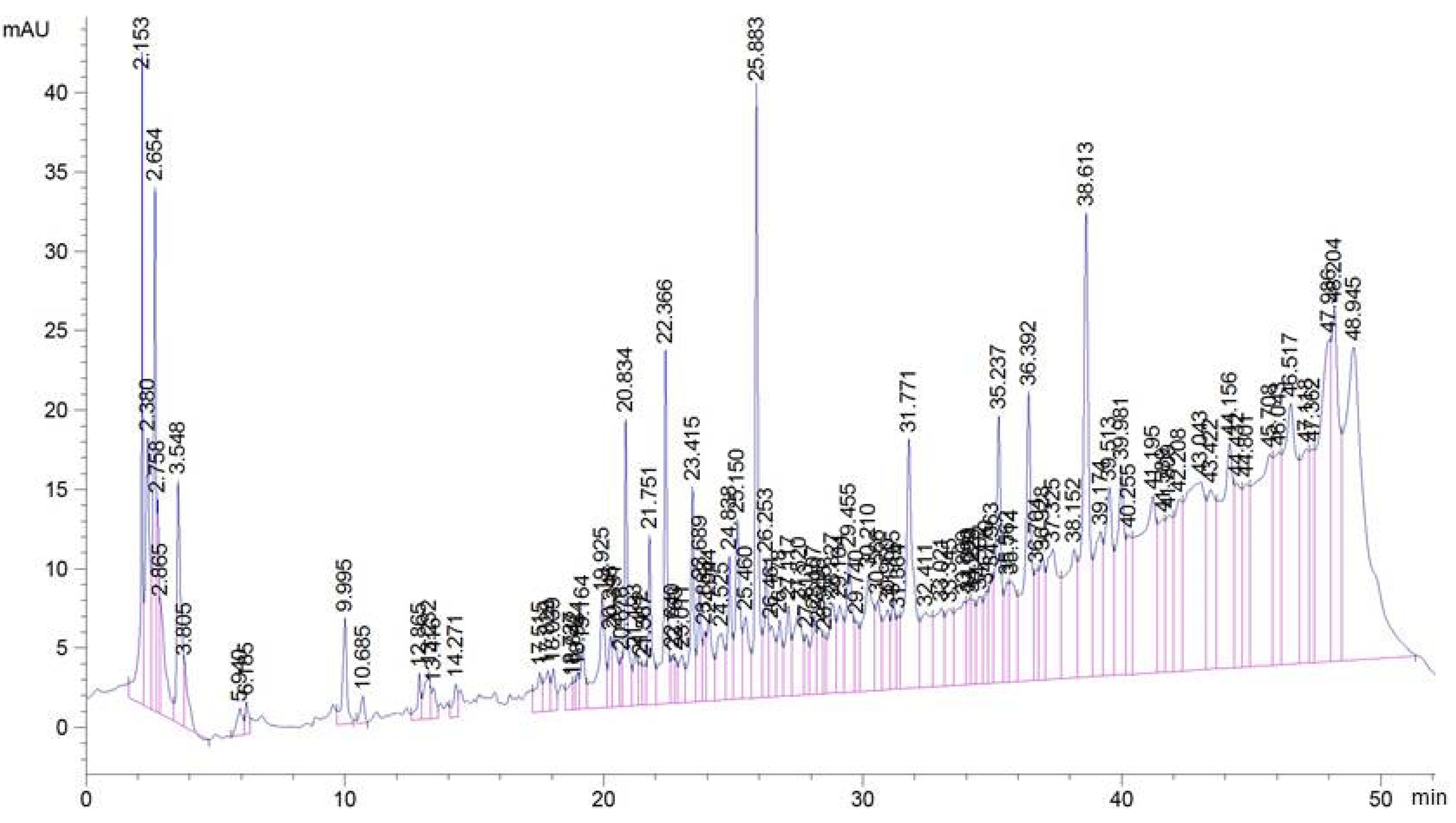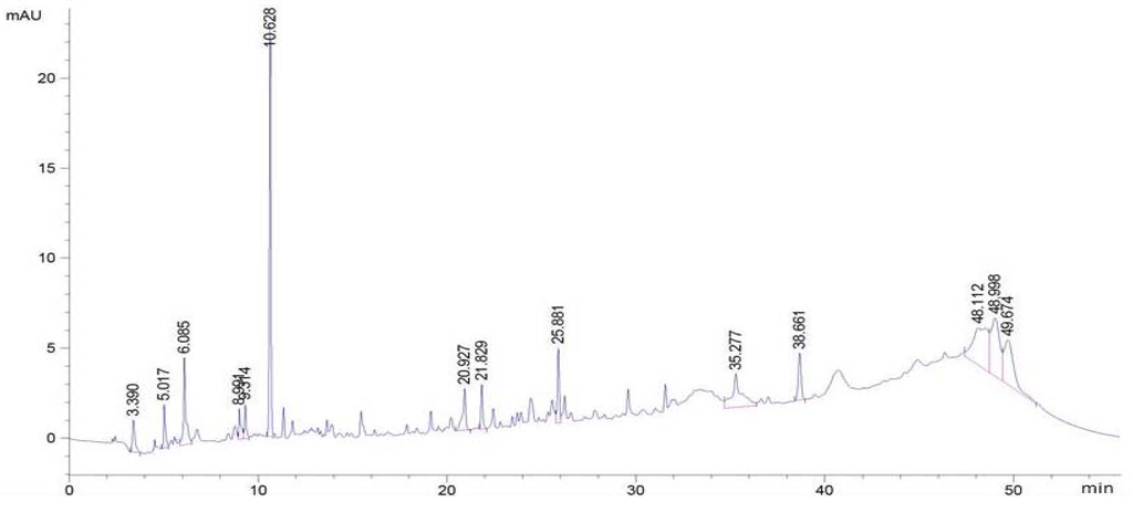 HPLC chromatograms of phenolic extracts from the barks of H. zenkeri recorded at 280 nm (TR: 19.10: 3,4-OH benzoic acid; 33.49:apigenin; 25.67: caffeic acid; 23.48: catechine; 29.43: eugenol; 14.38; gallic acid; 25.11: O-coumaric; 21.91:OH-tyrosol; 30.52: P-coumaric acid. 42.19: quercetin; 29.45: rutin; 25.55: syringic acid; 17.35: theobromine; 21.77: tyrosol and 25.27: vanillic acid.).