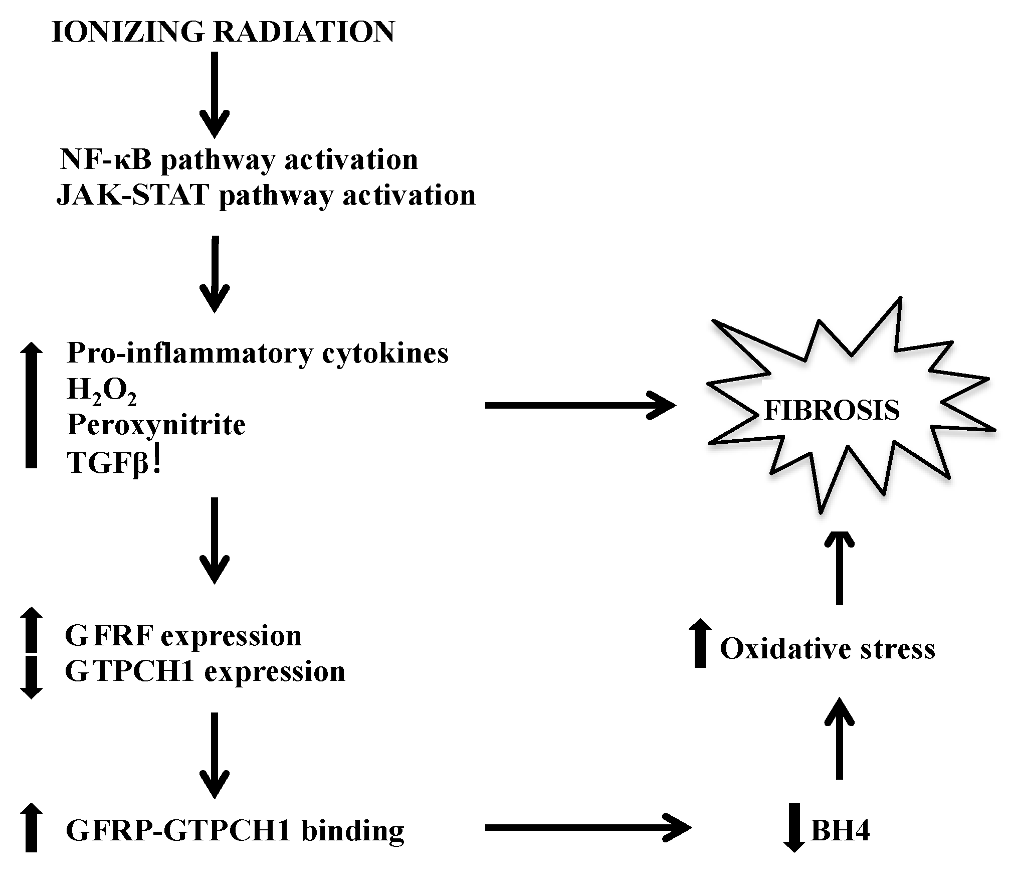 Various tissues are known to develop a fibrotic disorder months after the initial radiation insult, which is a consequence of delayed radiation effects. Chronic oxidative stress and inflammation are known to help drive the late effects and fibrosis, suggesting that IR-induced BH4 deficiency might play a direct and/or indirect role in tissue fibrosis (Figure 1).