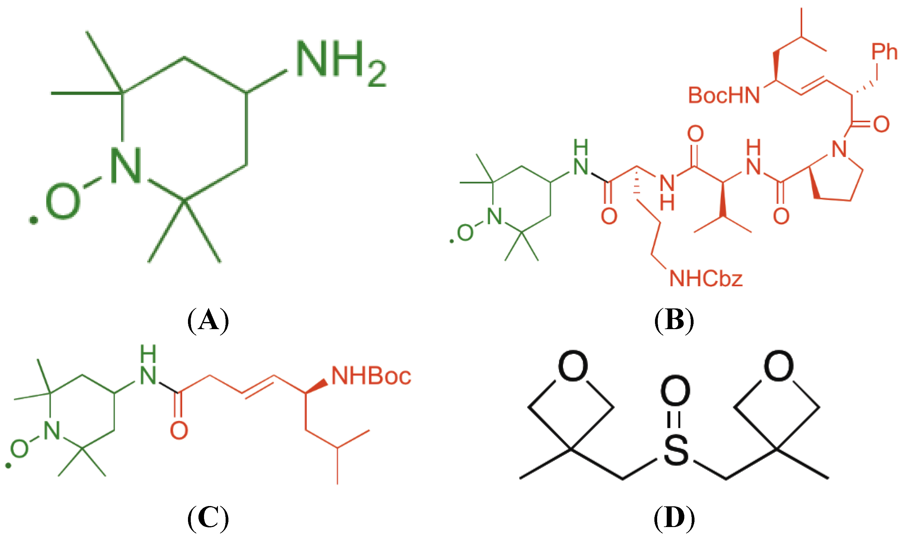 - Jiang, J.; Kurnikov, I.; Belikova, N.A.; Xiao, J.; Zhao, Q.; Vlasova, I.L.; Amoscato, A.A.; Braslau, R.; Studer, A.; Fink, M.P.; et al. Structural requirements for optimized delivery, inhibition of oxidative stress and anti-apoptotic activity of targeted nitroxides. J. Pharmacol. Exp. Ther. 2007, 320, 1050–1060. [Google Scholar] [CrossRef] [PubMed]