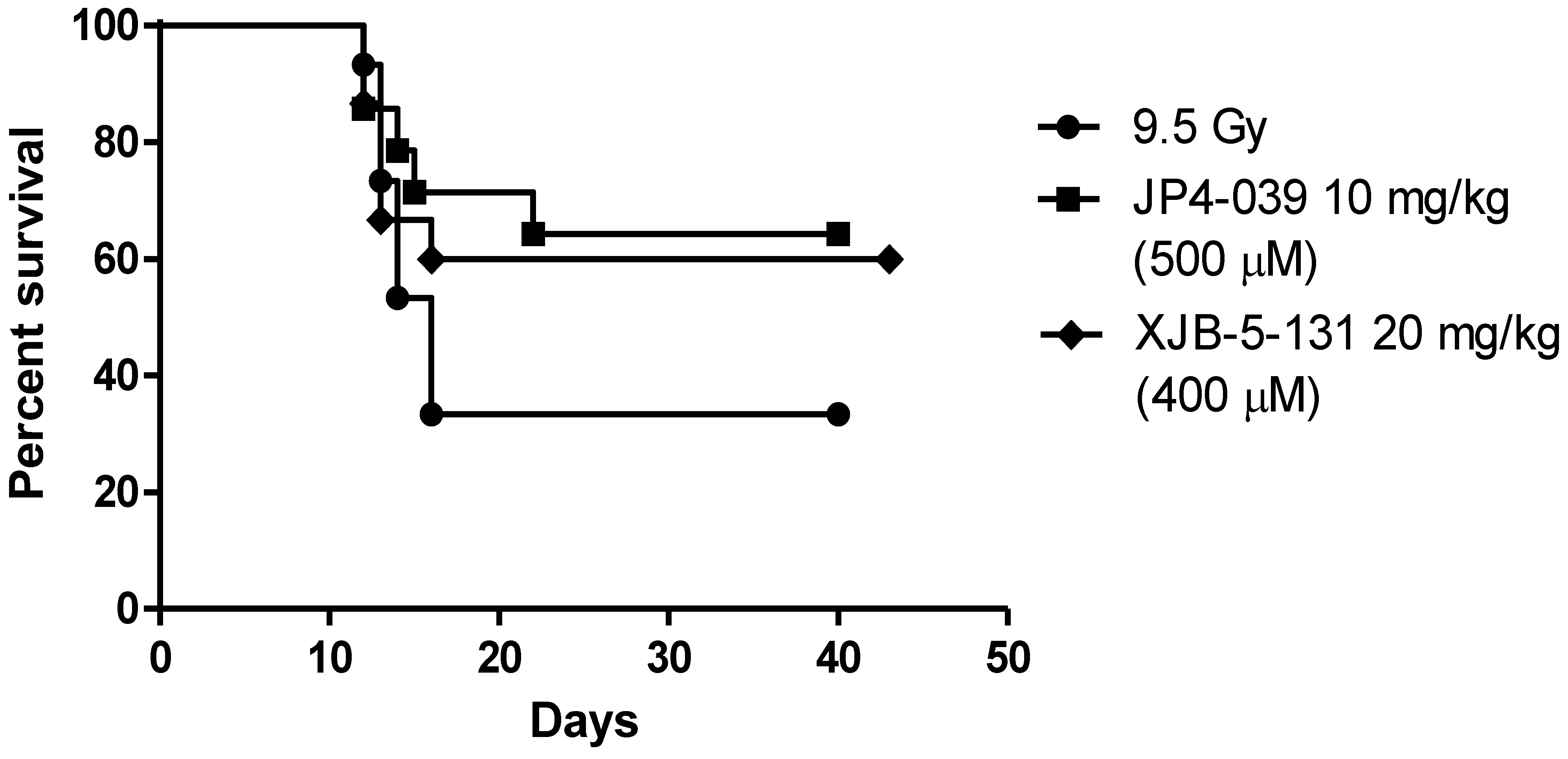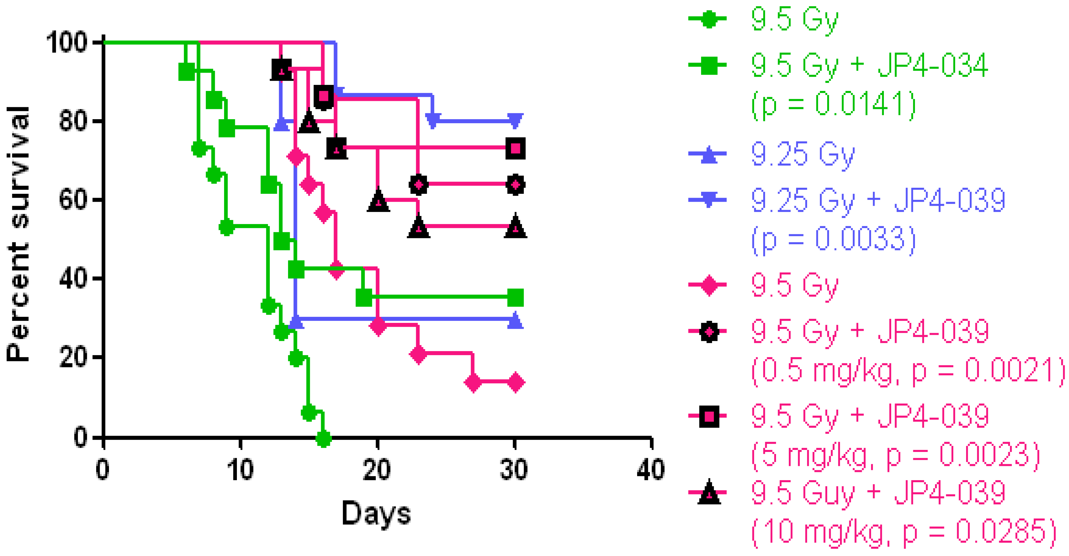 - Goff, J.P.; Epperly, M.W.; Shields, D.; Wipf, P.; Dixon, T.; Greenberger, J.S. Radiobiologic effects of GS-nitroxide (JP4-039) in the hematopoietic syndrome. In Vivo 2011, 25, 315–324. [Google Scholar] [PubMed]