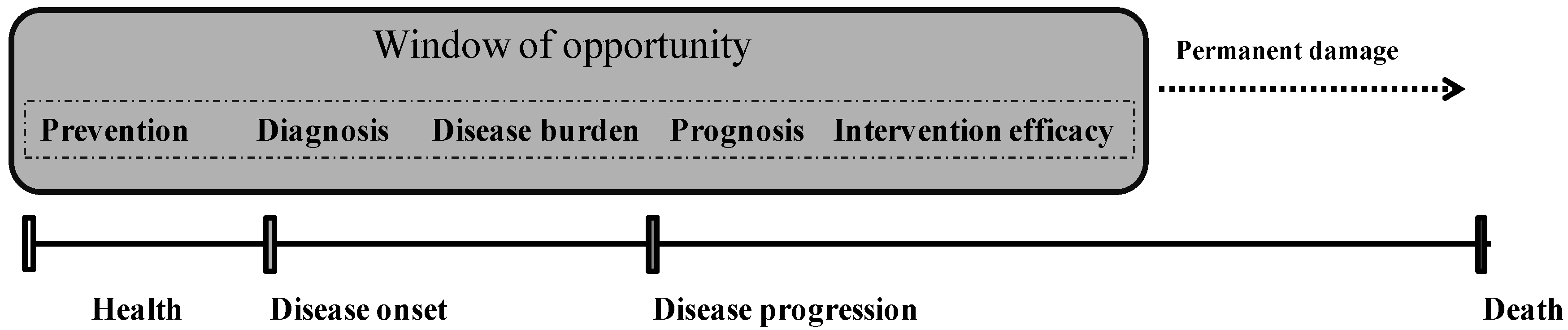 All these oxidative stress biomarkers can be measured in biological samples before onset and during disease progression, making them potentially helpful tools for assessing risk, diagnosing, determining disease severity and prognosis, and responding to treatments/interventions before permanent damage (Figure 1) [6]. In particular, biomarkers of risk and prognostic markers may identify subjects at high risk for disease onset (in those without disease) or disease progression (in those with existing disease). At diagnosis, a biomarker would distinguish between subjects with and without disease with good sensitivity and specificity. A burden of disease biomarker would help to stratify disease severity in patients with the disease. A biomarker to test the efficacy of intervention can be used to assess the short- or long-term changes associated with pharmacological treatments/lifestyle interventions. Many oxidative stress biomarkers have been found promising in many aspects, although further insights and validation approaches would greatly enhance our knowledge of their role in aging and disease and help to extend their application and significance in the clinical practice [6].
