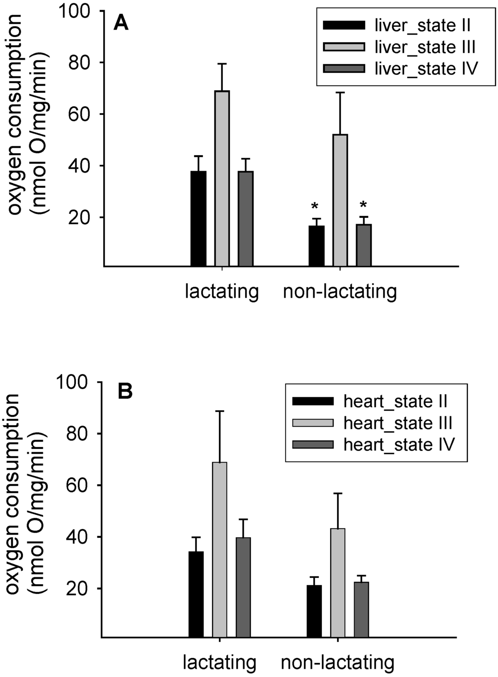 Oxygen consumption rates of isolated liver mitochondria (A) and isolated heart mitochondria (B) from lactating (n = 12) and control mice (n = 10). Data are means ± SEM; * p < 0.05 compared to lactating mice.