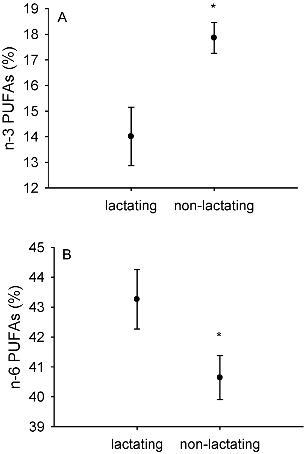 Content of n-3 (A) and n-6 (B) polyunsaturated fatty acids in isolated liver mitochondria from lactating (n = 12) and non-lactating (n = 10) mice. Data are means ± SEM; * p < 0.05, in comparison to lactating mice (F1,6 = 66.04; p = 0.0002).