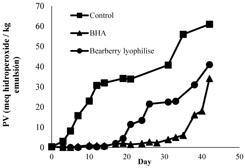 Methods have been developed to understand the effect of natural antioxidants in model foods such as emulsions and active film packaging. Adding natural antioxidants to food not only delays the oxidation process but also enhances the nutritional quality of the food through direct ingestion. In previous work, the effect of bearberry leaf extract in oil-water emulsion has not been described. A model emulsion was used to assess the deterioration of lipids at two stages of oxidation, which were the primary oxidation products (Peroxide Value) and the secondary oxidation products (TBARS). In addition, the change in pH was monitored, since pH tends to fall during oxidation.