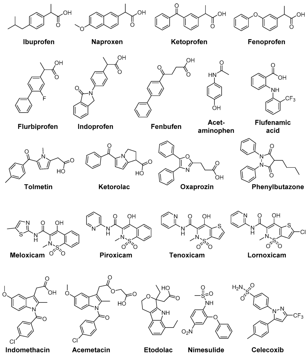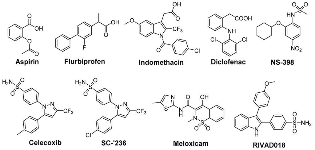 Increased levels of reactive oxygen species respectively signs of oxidative stress (protein oxidation and lipid peroxidation) have been found in a number of pathologies like rheumatoid arthritis, diabetes, cardiovascular diseases as atherosclerosis or hypertension, and neurodegenerative disorders like Parkinson’s or Alzheimer’s disease []. For example, osteoarthritis (OA) is a multifactorial disease and the underlying pathophysiological processes comprise the release of AA by PLA2 from damaged cells and subsequent conversion to inflammatory mediators by COX and 5-LOX enzymes as well as higher levels of oxidative species and antioxidant enzymes in the synovial fluids []. Due to the importance of ROS for these in part also inflammatory diseases, several NSAIDs and COX-2 selective inhibitors have been evaluated in terms of ROS scavenging activity in the past. For a comprehensive overview about assays for evaluating ROS scavenging activity the reader is referred to an excellent review by Magalhaes et al. []. Figure 4 shows NSAIDs and COXIBs in clinical use, which have been identified as antioxidant compounds.