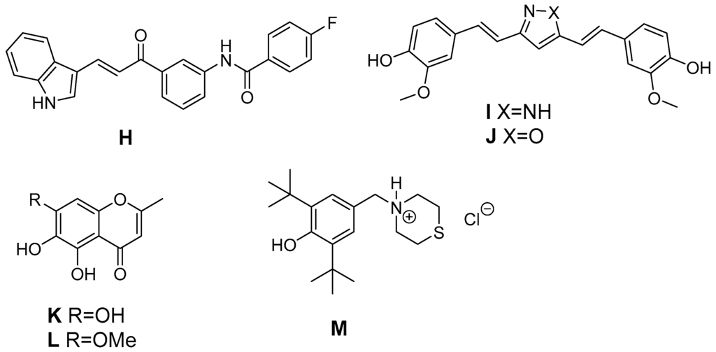 In addition, natural antioxidants served as leads for the development of antioxidant COX-2 inhibitors (Figure 6). The antioxidant curcumin has a wide variety of positive effects on the inflammatory pathway, e.g., the suppression of NF-κB caused induction of COX-2 in Kupffer cells and lung cancer cells []. Asymmetrical indole curcumin analogs, i.e., N-(3-(3-1H-indole-3-yl)acroyl)phenyl)-4-fluorobenzamide (H), were found to inhibit COX-2 (83% @ 10 µM) and to be moderate DPPH radical scavengers (44% @ 10 µM) and K3[Fe(CN)6] reducing agents (35% @ 10 µM) []. Pyrazole (I, X = NH) and isoxazole (J, X = O) based curcumin analogs have been synthesized by Selvam et al. to elucidate structure activity relationship regarding COX inhibition and antioxidant activity []. Both analogs were COX-1 selective inhibitors with radical scavenging activity in the DPPH assay like curcumin. However, the synthetic analogs showed a slightly improved COX-2 inhibitory activity (e.g., pyrazole: COX-1: 80% inhibition @ 100 µM, COX-2: 61% inhibition @ 100 µM). Naturally occurring chromones have been reported to exert anti-inflammatory, antioxidant, and a variety of other pharmacological activities targeting among others COX, NO production, and PKC. A series of stellatin derivatives (K, L) was synthesized by Gautam et al. to evaluate their COX inhibition profile as well as antioxidant capacity in a DDPH and an ABTS assay []. The novel stellatin derivatives showed only slight COX-2 selective inhibition having IC50 values in the µM range for COX-1 and COX-2. Interestingly, two compounds, both characterized by hydroxyl-groups at position 6 or 7 of the chromone, showed antioxidant capacity comparable to trolox and curcumin []. Ziakas et al. created a set of butylated hydroxytoluene derivatives. 2,6-Di-tert-butyl-4-thiomorpholin-4-ylmethylphenol hydrochloride (M), the most potent derivate of the series, was found to be a selective COX-1 inhibitor (IC50 COX-1 = 6.5 µM), an inhibitor of lipoxygenase and additionally an antioxidant as evaluated in a lipid peroxidation model and DPPH assay []. Of note, inhibition of COX-1 was observed only at 0.1 µM but not higher concentrations of arachidonic acid indicating the competitive nature of this inhibitor. The synthetic analog α-tocopheryl succinate (αTOS), showed a concentration dependent COX-2 inhibition (e.g., 63% at 30 µM), in contrast to tocopherol, as evaluated by measuring lipopolysaccharide (LPS) induced PGE2 formation in RAW264.7 cells [].