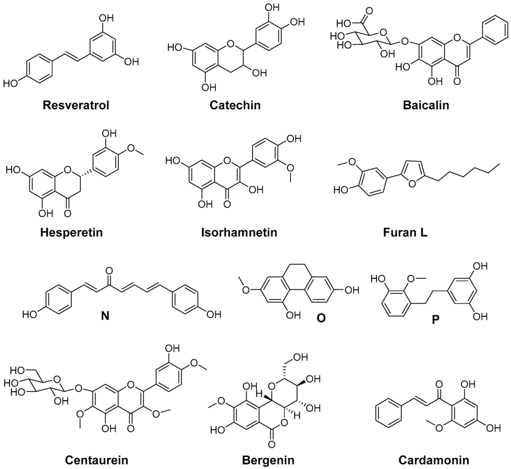 Natural antioxidants (Figure 7) were found to have COX inhibitory activity as well, although the potency of these compounds is rather low. PGE2 and ROS production by microglial cells is associated with neuroinflammation. In this context, the natural antioxidant resveratrol, trans-3,5,4′-trihydroxystilbene, was investigated in vitro using microglial cells stimulated by lipopolysaccharide. At concentrations higher than 1 µM, resveratrol was able to inhibit the formation of ROS derived 8-iso-PGF2α and COX-2 derived PGE2 formation thus targeting two important pathophysiological pathways []. Flavocoxid, a FDA regulated prescription in the United States, is an extract containing a mixture of catechin and baicalin. Among others, it reduces COX-2 expression as a consequence of NF-κB modulation as well as COX activity by inhibition of peroxidase activity and is additionally a LOX inhibitor and a strong antioxidant (oxygen radical absorbance capacity, ferric reducing/antioxidant power, peroxynitrite radical averting capacity). Open label clinical trials indicated efficacy of flavocoxid in patients with osteoarthritis together with a good overall and gastrointestinal tolerability [,]. The flavones hesperidin and its aglycon hesperetin were found to inhibit LPS-induced COX-2 gene expression at a concentration level of 250 µM and to exert ROS scavenging activity in an AIBN and benzoyl peroxide based assay []. Isorhamnetin, an antioxidant 3′-O-methylated metabolite of quercetin, was shown to exert its anti-inflammatory effects in part by reduction of COX-2 mRNA synthesis and protein expression []. Furan L was found to be a slightly selective and moderately potent COX-2 inhibitor having an IC50 in the µM range for COX-1 and COX-2, and to possess 5-LOX inhibition potency as well as low antioxidant activity compared to α-tocopherol. However, furan L showed cytoprotective effects on neuronal cells death induced by glutamate or lipopolysaccharide []. Dioscorea opposite (Dioscoreaceae) is widely used in China, Japan, and Korea as a traditional medicine with anti-inflammatory activity. Yang et al. determined the chemical constitution by isolating 19 aromatic compounds from the chloroform soluble fraction and tested the antioxidative and COX-2 inhibitory activity of these compounds []. Four selective and two unselective inhibitors of COX-2 with IC50 (COX-2) in the low mg/L level were identified which additionally exerted ROS scavenging activity in either both, DPPH and O2•−scavenging assay, or in one of them. The chemical structures of 3,3′,5-trihydroxy-2′-methoxy-bibenzyl (N), (4E,6E)-1,7-bis(4-hydroxyphenyl)-4,6-heptadien-3-one (O), and 9,10-dihydro-7-methoxy-2,5-phenanthrenediol (P) are shown as examples for a DPPH, a O2•−, and a DPPH and O2•− scavenger, respectively, illustrating also the chemical variety of the isolated COX-2 selective compounds []. Tridax procumbis L. (Compositae) is used in traditional Indian medicine by application of the poultice of the whole plant because of its anti-inflammatory activity. Jachak et al. observed anti-inflammatory efficacy by all three selected extracts of the aerial parts of the plant in the carrageenan-induced rat paw edema assay in vivo and isolated three compounds as an attempt to identify COX inhibiting compounds []. In that course, the extract constituents centaurein and bergenin were found to be rather weak scavengers of ROS in the DPPH and 2,2'-azino-bis(3-ethylbenzothiazoline-6-sulphonic acid (ABTS) assay (IC50 > 100 µM), and to be weak inhibitors of COX-2 showing 42% and 21% inhibition at 100 µM, respectively, and a distinct selectivity for COX-1. The extracts were shown to exert unselective COX inhibition in the range of 38%–66% at a concentration of 50 µg/mL and ROS scavenging with IC50 in the range of 18–46 µg/mL which revealed that COX inhibition and ROS scavenging may be at least in part the mode of action of the anti-inflammatory extracts []. Cardamonin is a naturally occurring chalcone isolated from Zingiberous herbaceous plant species and traditionally used for its anti-inflammatory activity. It was found to be a scavenger of NO2− and intracellularly produced ROS in LPS/interferon γ (IFN-γ) stimulated RAW264.7 cells, a suppressor of TNF-α synthesis and an inhibitor of COX-1 and COX-2 activity with IC50 in the low to middle µM level [].