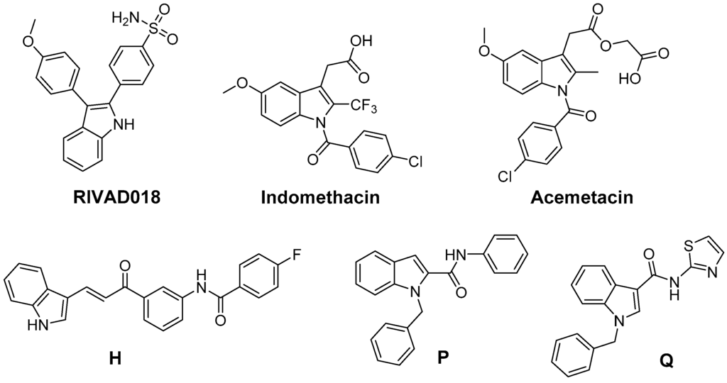 - Hu, W.; Guo, Z.; Yi, X.; Guo, C.; Chu, F.; Cheng, G. Discovery of 2-phenyl-3-sulfonylphenyl-indole derivatives as a new class of selective COX-2 inhibitors. Bioorg. Med. Chem. 2003, 11, 5539–5544. [Google Scholar] [CrossRef] [PubMed]