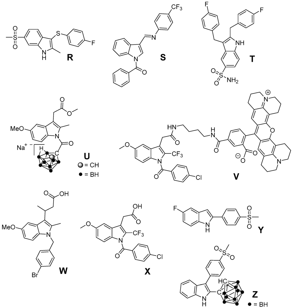 Based on the finding that several structurally simple as well as complex indole-based compounds possess antioxidant potency due to inherent properties of the indole heterocycle, we suggest that also a variety of indole-based COX inhibitors, as discussed below, should display antioxidant properties (Figure 9). For instance, 3-arylthio-2-methyl-6-methylsulfonyl-1H-indole R as presented by Campbell et al. as well as N-benzoyl-substituted 3-[(phenylimino)methyl]indole S described by Kaur et al. were found to exhibit selective COX-2 inhibition in the nanomolar range [,]. The 5-aminosulfonyl-substituted 2,3-dibenzyl-1H-indole T was found to be a rather weak (67% inhibition of COX-2 at 50 µM) but selective COX-2 inhibitor []. Indomethacin represents a clinically used NSAID known to exert ROS scavenging activity [,]. Based on the fact that by esterification or amidation of indomethacin further COX-2 selective inhibitors can be obtained, several substituted indomethacin derivatives have been synthesized so far [,,,,,]. Recently, the novel COX-2 selective and, noteworthy, hydrophilic indomethacin ester derivative U was identified by replacement of the benzoyl group with a for COX-2 inhibitors novel pharmacophore, a nido-carbaboran cluster []. Of note, the indomethacin-ROX conjugate fluorocoxib-A as well as its trifluoromethyl-analog V represent promising COX-2 selective inhibitors having fluorescent properties suitable for fluorescence-based imaging of COX-2 in vivo [,]. Further COX-2 selective indomethacin analogs with a free carboxylic acid group have been synthesized, e.g., by extension of the acyl side chain (W) [] or by replacement of the methyl with an trifluoromethyl group (X) []. A selective COX-2 inhibition by 5-fluoro-2-(4-methylsulfonylphenyl)-1H-indole (Y, IC50 COX-2 = 0.1 µM; IC50 COX-1 = 12.5 µM) was described by Zarghi et al. []. Of note, Suzen et al. described DPPH and O2•− scavenging as well as inhibition of lipid peroxidation by structurally similar 2-phenylindole derivatives []. Beside antioxidant 2,3-diphenyl-based COX-2 inhibitors like RIVAD018 that have been discussed above, we synthesized 2-carbaboranyl-3-phenyl-1H-indole derivatives and found abolished COX-2 inhibition by replacement of the 2-phenyl ring with this pharmacophore. However, the ortho-carbaboranyl-substituted derivative Z of this class was found to be a COX-1 inhibitor (IC50 COX-1 = 1.6 µM; IC50 COX-2 > 4 µM) []. Although these indole-based COX inhibitors have not been identified as antioxidants yet, the antioxidant capacity of other indole-based compounds suggests potent ROS scavenging for these compounds as well so that further studies are warranted.