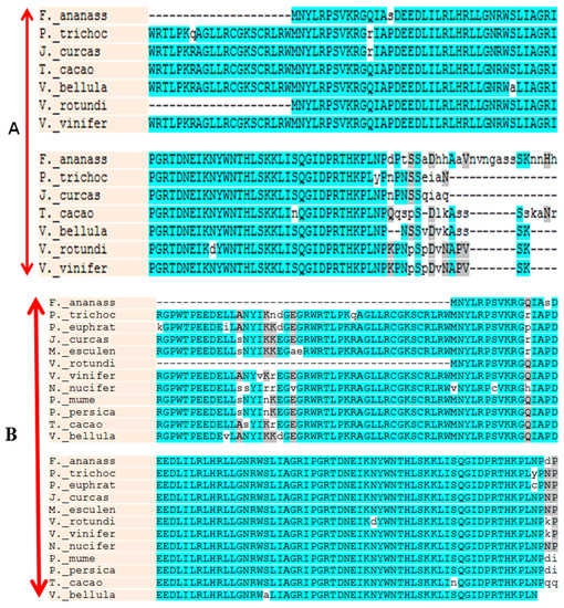 Amino acid sequence alignment of MybA1 (A); and MYBCS1 (B) proteins from different plant species. Residues highlighted in blue represent identical and similar amino acids, respectively. The alignment was performed using multi-align software as defined in the Materials and Methods section.